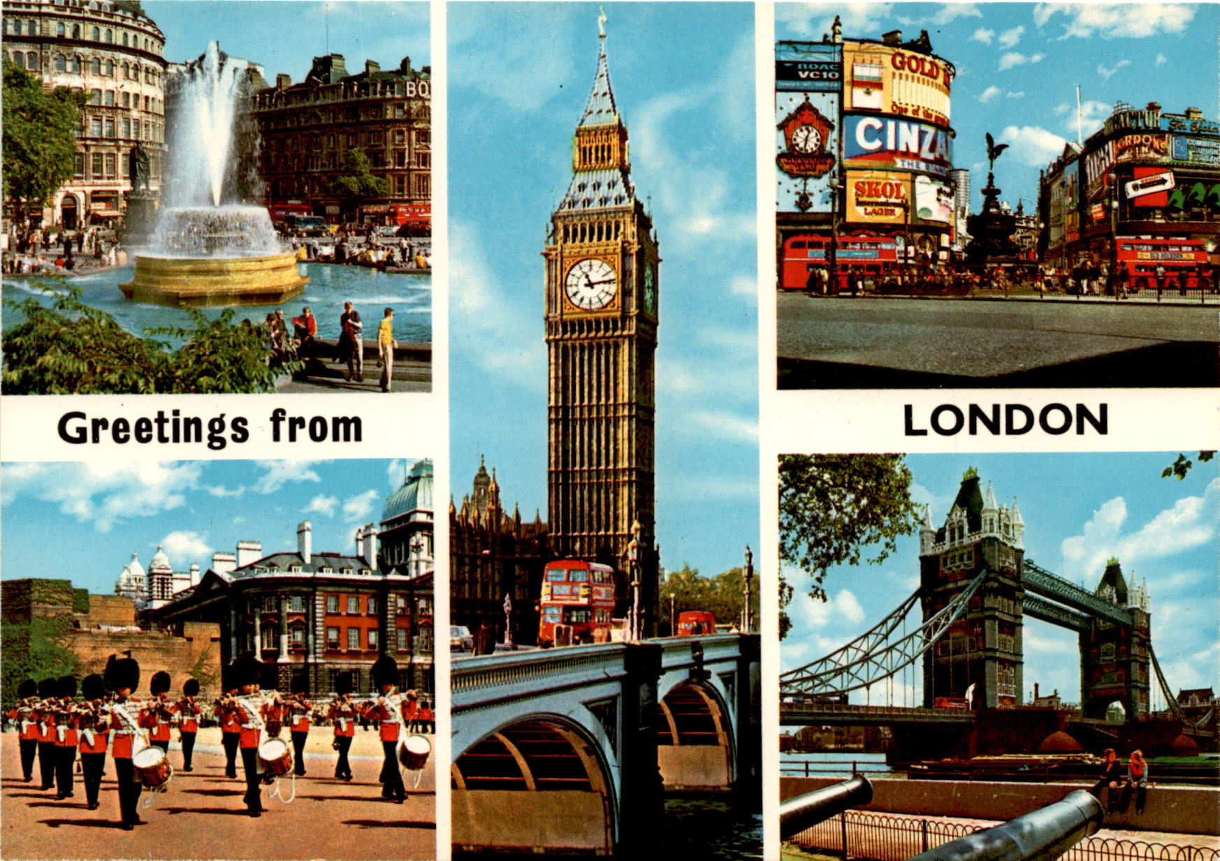This postcard features a greeting from London, one of the most fascinating cities in the world. It showcases the contrast of culture, traditions, old and modern buildings, parks, and vibrant night life that leaves a memorable impression on every visitor. The postcard is published by I.V, P. .Ltd .London England and produced in Israel by Palphot Ltd.