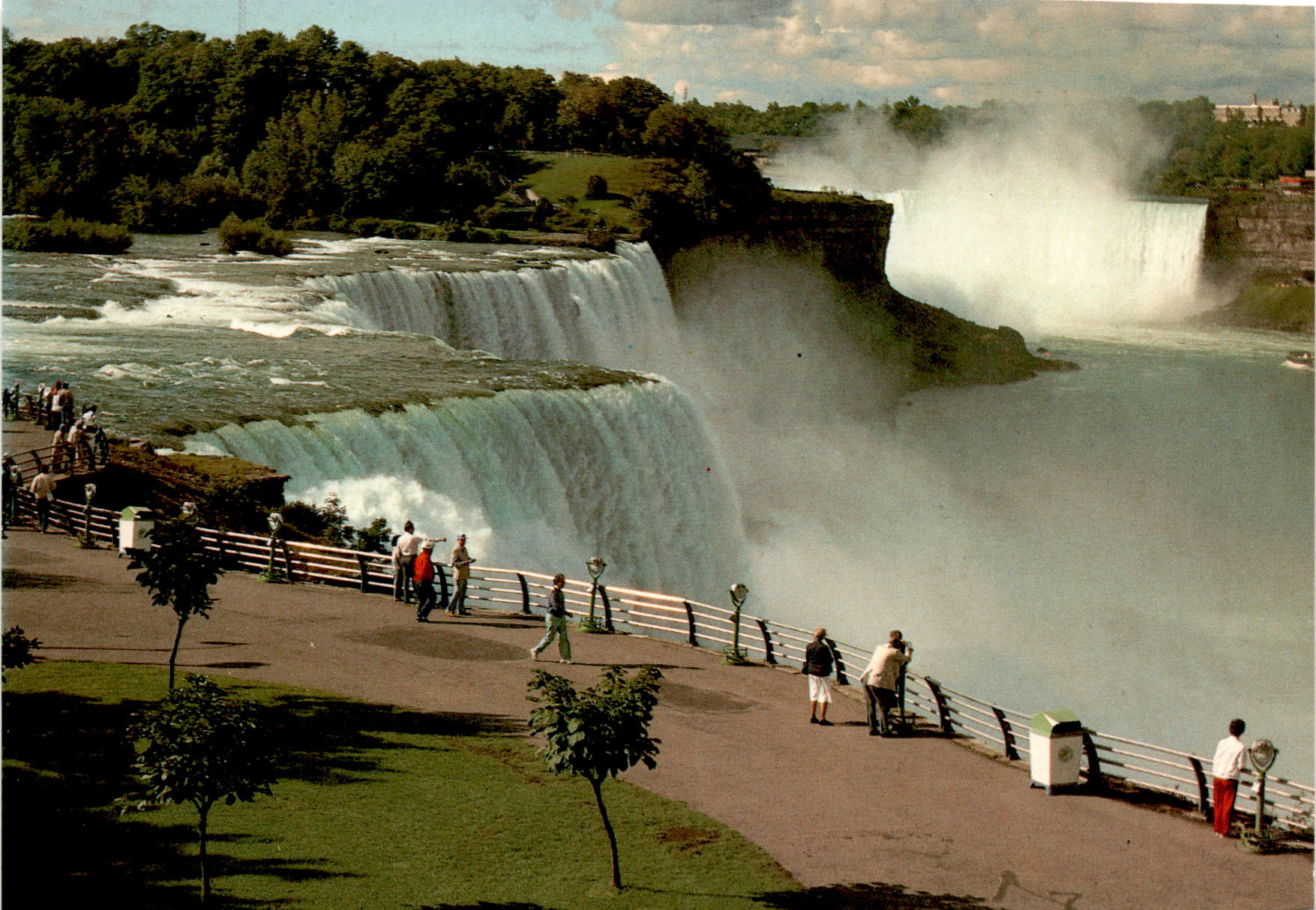 This postcard features a panoramic view of Niagara Falls in New York. The image shows the American Falls and Niagara River in the foreground, with the Horseshoe Falls in the background. The photo was taken by Werner J. Bertsch and the postcard is exclusively distributed by HOST INTERNATIONAL INC. It is made by KINA ITALIA and the address is in Niagara Falls, New York. The postcard has the code NF 1010.