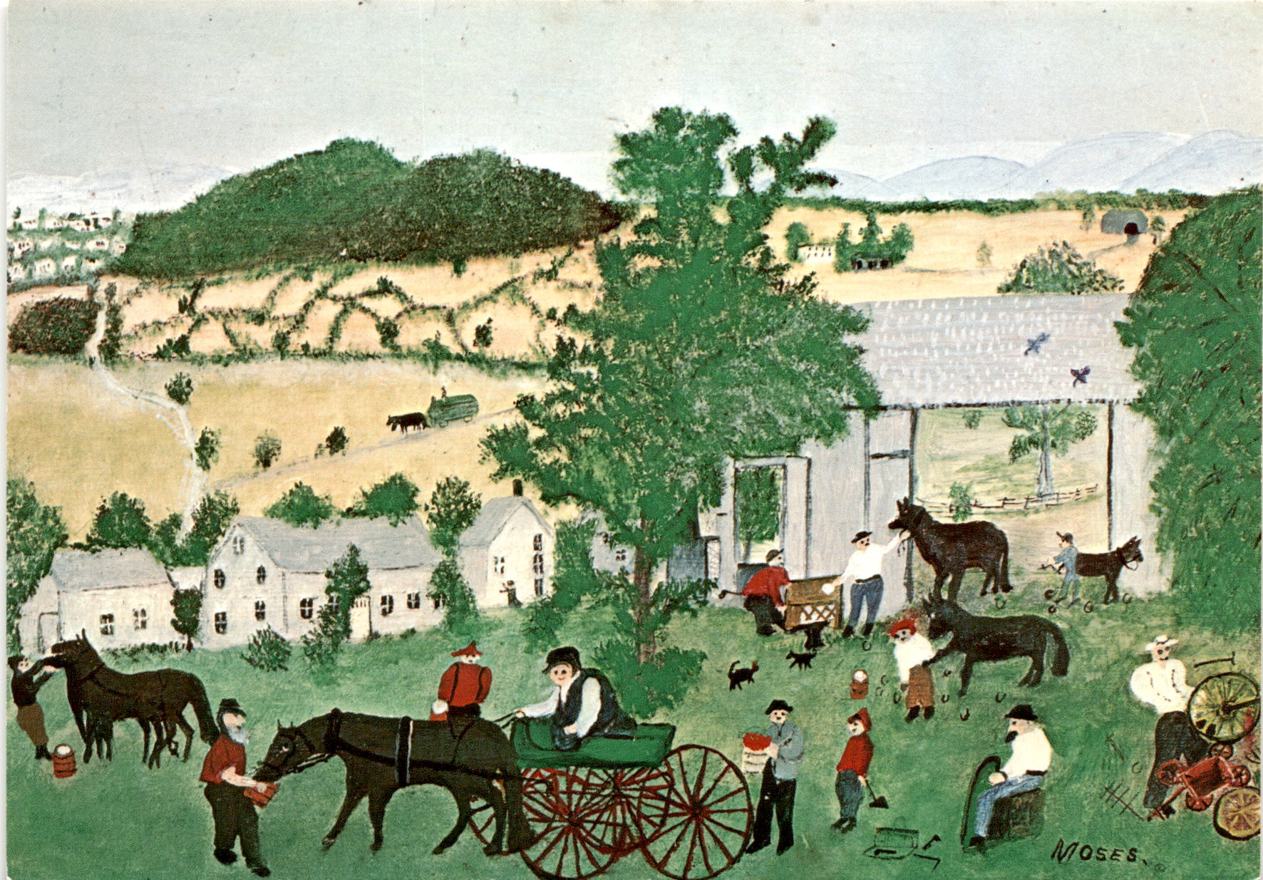 Postcard features Grandma Moses’ painting of a wagon repair shop.