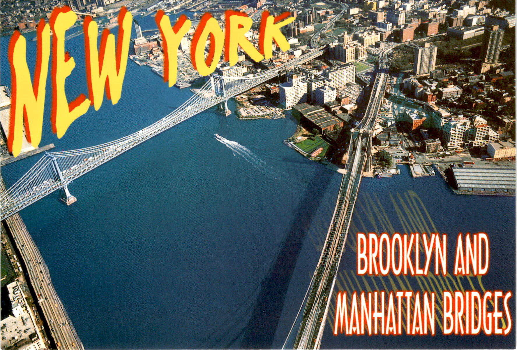 This postcard features a photo of the Brooklyn and Manhattan bridges in New York City, taken from the Brooklyn side. The photo is credited to A.M.B. and is part of the collection of great photography available online at www.BeenThereSawThat.com/nyc. The postcard is associated with City Merchandise, a company based in Italy and designed by J. Carlos Burga. For more information or to purchase the postcard, visit www.citymerchandise.com or contact them via email at citymdse@aol.com or by phone at (718) 832-2931. The postcard is widely available and represents the iconic bridges of New York City.