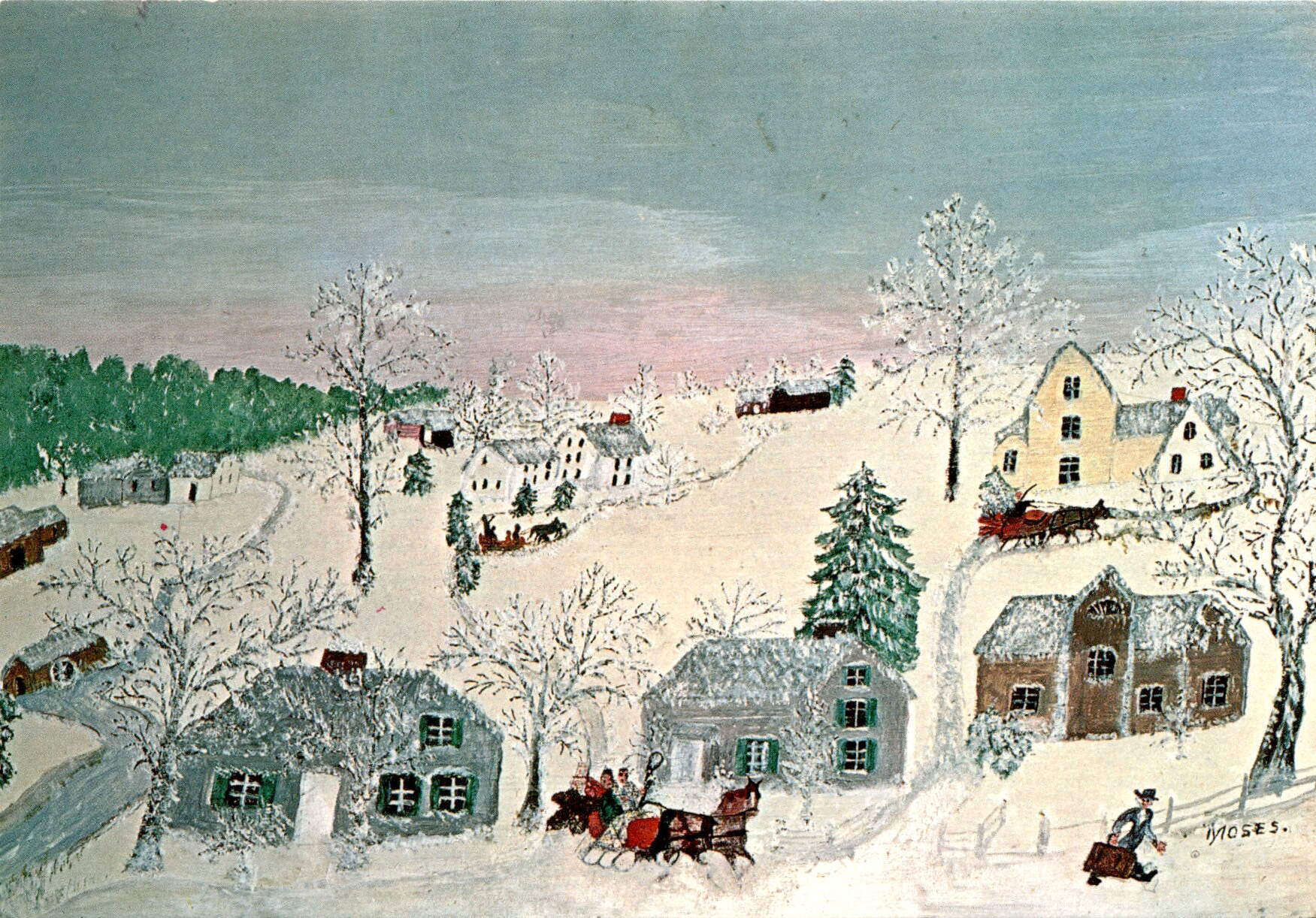 This postcard features a painting called “ONE HORSE SLEIGH” by Grandma Moses, created in 1960. It is part of the collection of Bennington Museum in Bennington, Vermont. The postcard is published exclusively by Bennington Museum and copyrighted by Grandma Moses Properties, Inc. The photography was done by Frank L. Forward.