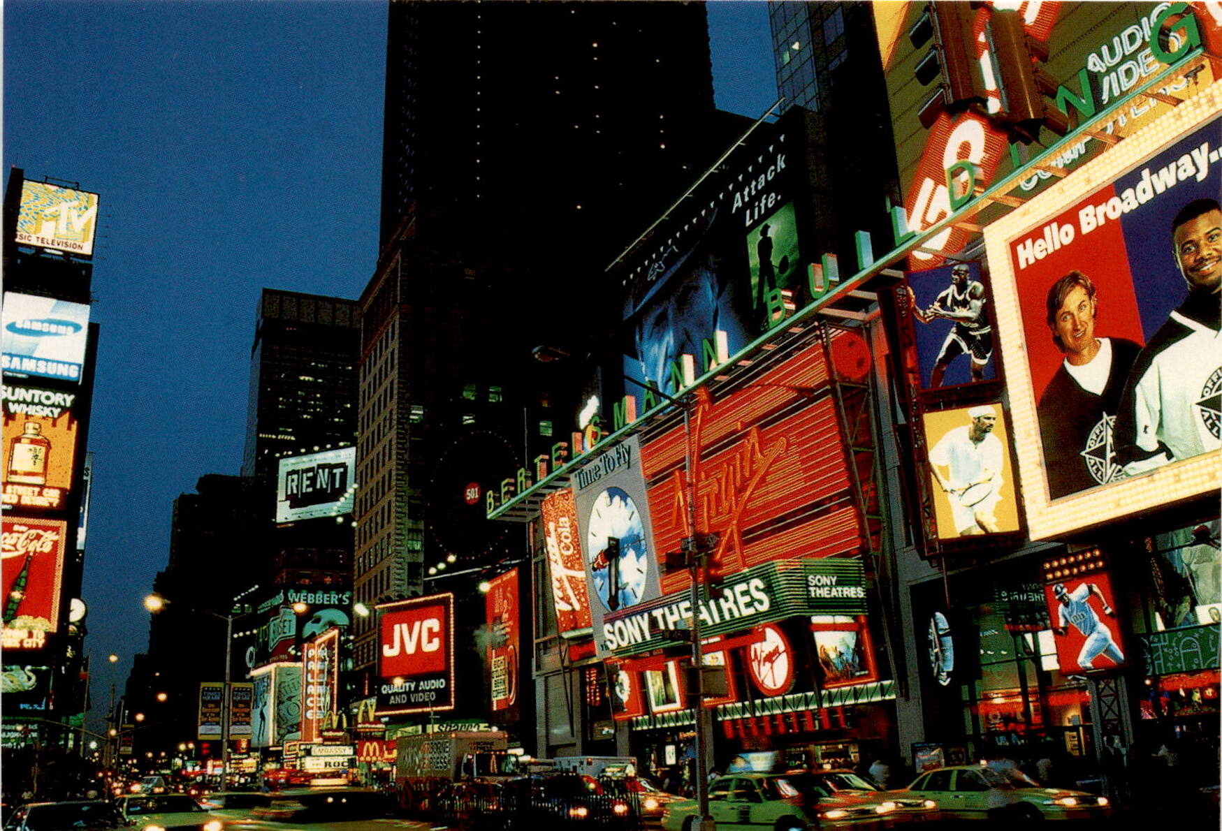 Back of PostcardThis postcard features various brands and names, including SIC Television, Samsuns, Samsung, Suntory Whisky, Cola, Pier, Spor, Rent, Webber’s, Roc, JVC, Quality Audio and Video, Shan, Time To Fly, BERTERS, Attack, Life, Sony The Aires, Anna Kana, Sony Theatres, Mes, Right, *2013*17255, Audi, Vide, Hello Broadway, Da, Tool, and Off. The postcard also mentions Exciting Times Square, known as “The Crossroads of the World,” and includes greetings from New York City. The postcard was published by Host Services in New York and features a photo by Alan Schein. It was printed in the E.E.C. by Kina KG.