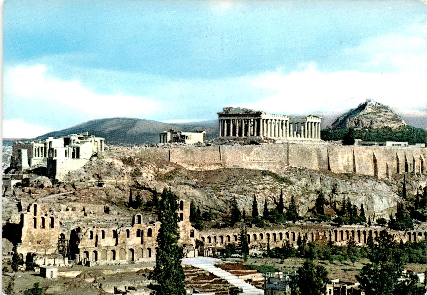 The postcard features a stunning image of the Acropolis in Athens, Greece. The text on the postcard is written in multiple languages, including English, French, German, and Italian. The postcard is produced by a company called Delta, located in Athens. The contact information for Delta is provided on the postcard.