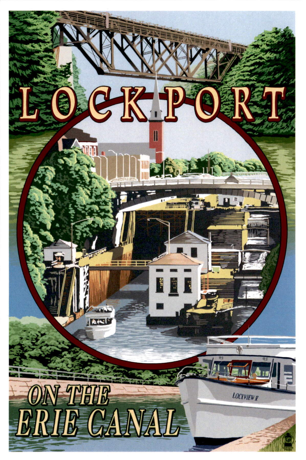 This postcard features a scenic montage of Lockport, New York, located on the Erie Canal. It showcases the Lockview in Lockport and is an original poster by Lantern Press. The image number is 32357 and it is produced by O Lantern Press in Seattle, WA. The postcard is suitable for uploading as an ecommerce description.