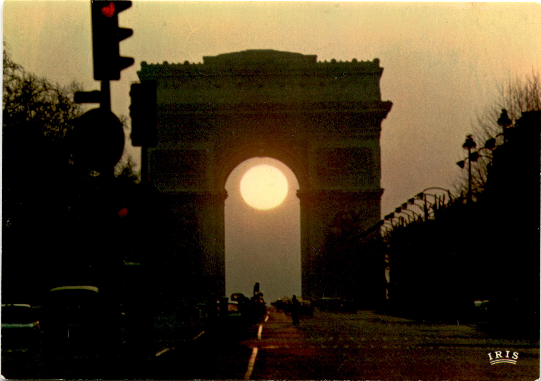 This postcard features a printed image of a sunset over the Champs Elysées and the Arc de Triomphe in Paris, France. It is part of the IRIS de France collection and is printed by Editions CHANTAL. The postcard is not allowed to be reproduced. The image was taken by Chambon – VLOO and printed using MEXICHROME technology.