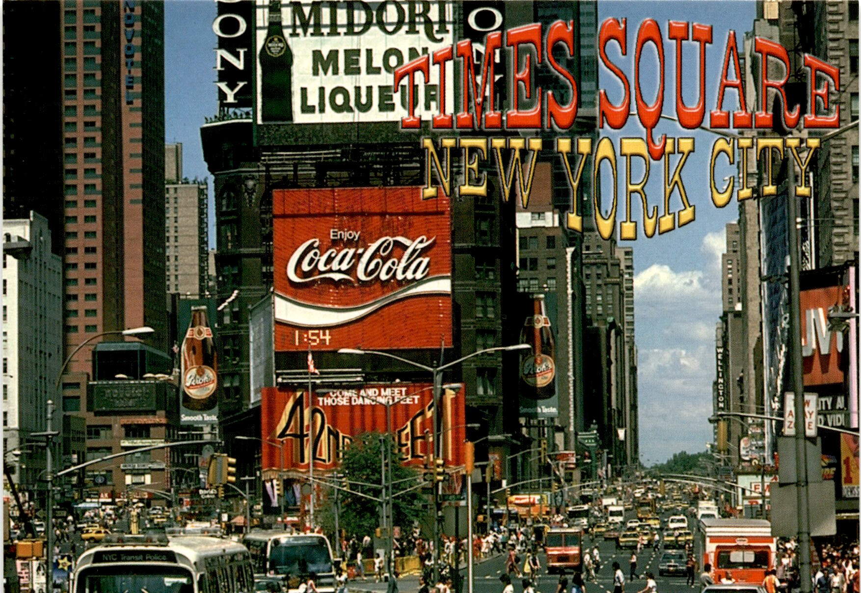 This postcard features a vibrant image of Times Square in New York City, located in the heart of the Theater District. The postcard also includes the iconic Coca-Cola logo and the phrase “COME AND MEET THOSE DANCING FEET.” The postcard is printed by Alfred Mainzer, Inc. in Long Island City, NY and is made with smooth taste. It is a great souvenir to remember your visit to the city.