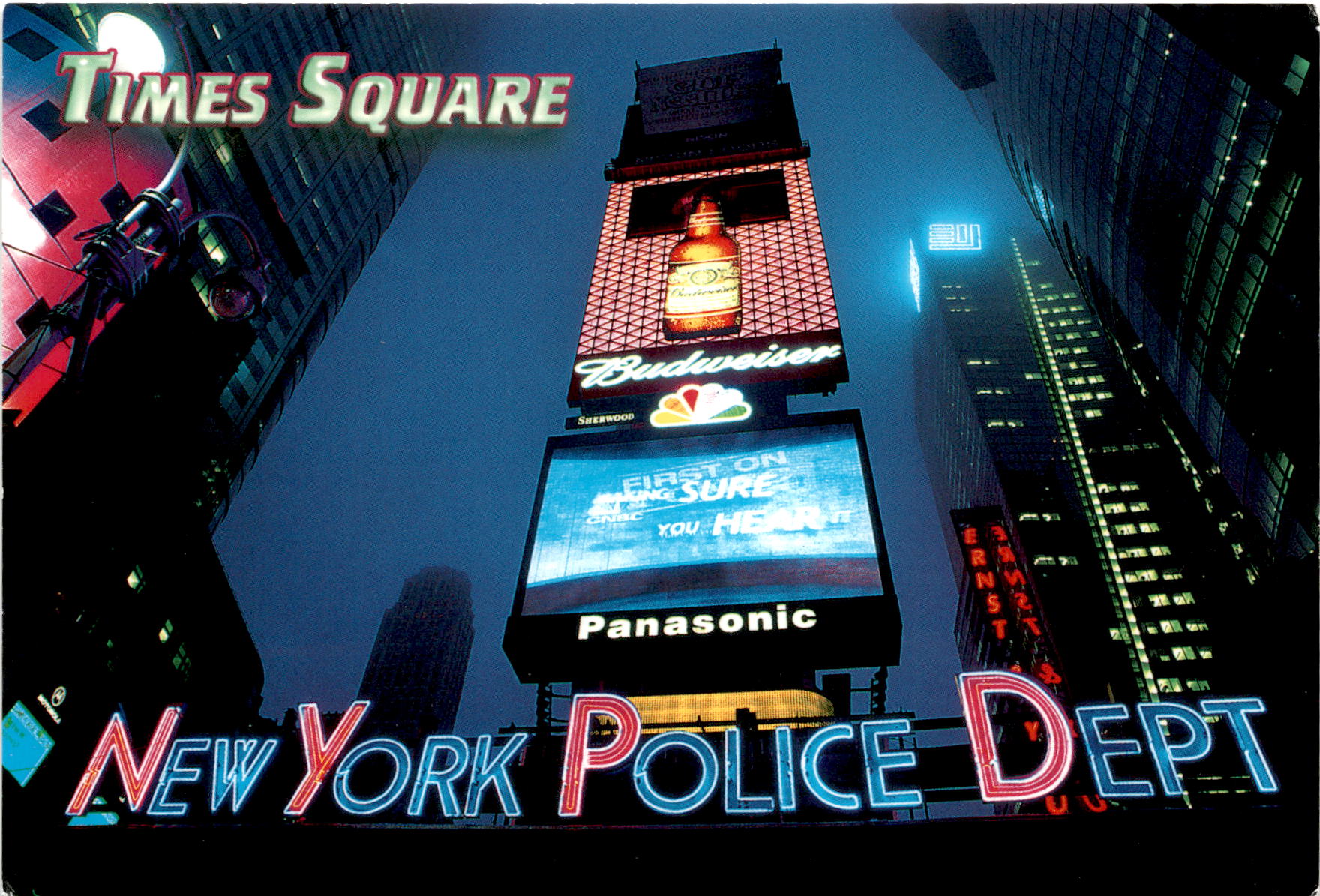 This postcard features a photo of Times Square in New York City. The image captures the iconic Budweiser sign, as well as other notable landmarks such as Sherwood, Nostios, SOR, FIRST ON, TENSURE, YOU HEAR, GNBC, and Panasonic. The postcard also includes a mention of the New York Police Department and the photographer, Alan Schein. The address and contact information for City Merchandise, the company selling the postcard, is provided. The postcard is a greeting from Times Square in New York City.