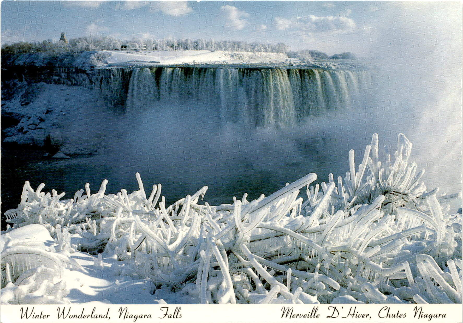 Back of PostcardThis postcard features a winter wonderland scene at Niagara Falls. The image showcases the majestic power of the falls as it creates a beautiful sculptured landscape. The postcard is made in Canada by Dexter Color and is associated with the Niagara Parks Commission. It is a high-quality postcard that captures the beauty of Niagara Falls during the winter season.