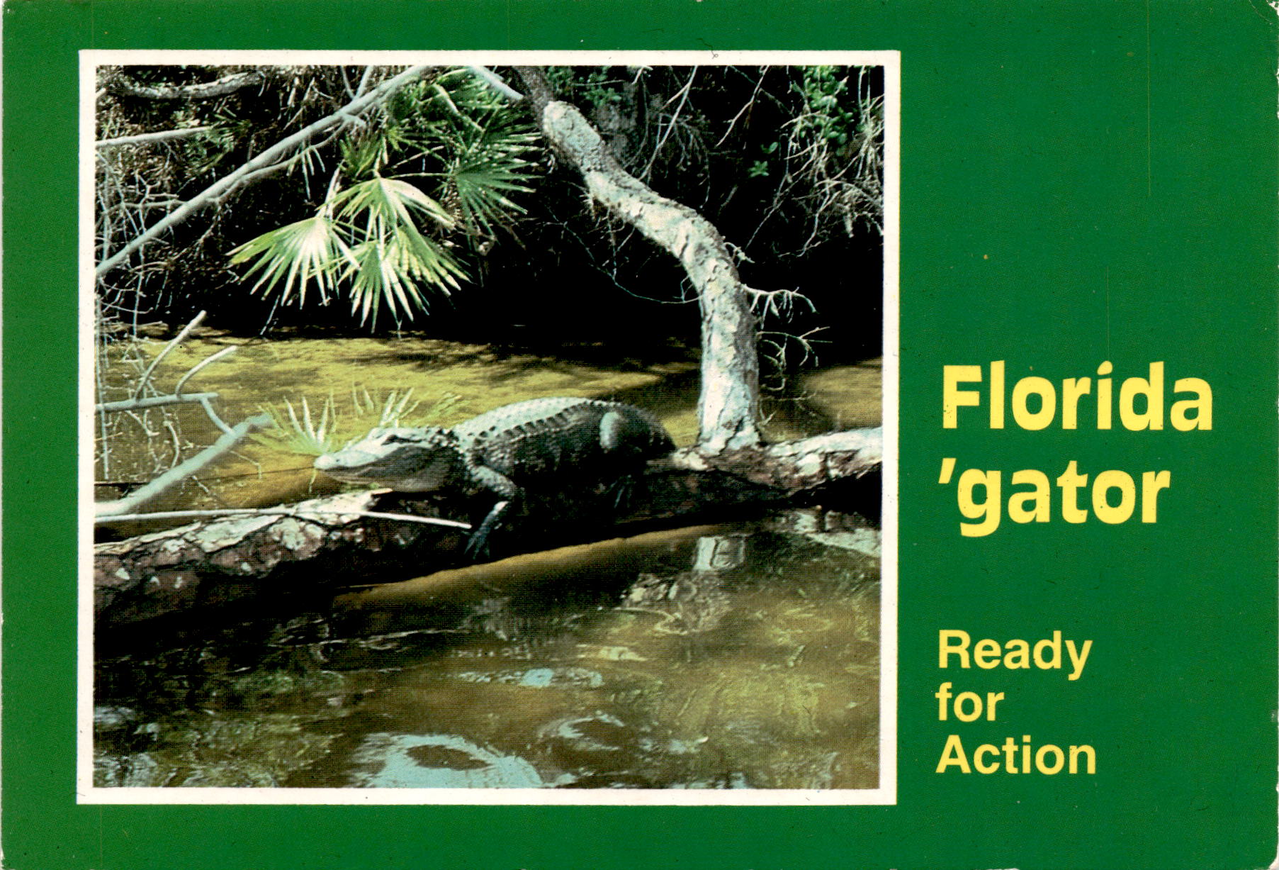 The theme of this postcard is a lively and energetic representation of Florida, featuring an alligator ready for action. It is a greeting from the Sunshine State, showcasing the trademark of A Paper Magic Company. The postcard is produced by Plastichrome and is from Boston, MA. The postcard number is P334526.
