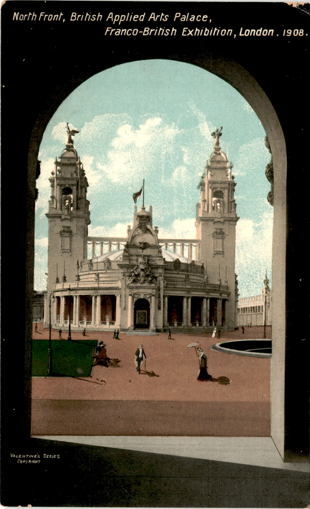 This text is a description of a postcard from the Franco-British Exhibition in London in 1908. The postcard is part of the Valentine’s Series and was printed by Valentine & Sons Ltd. in Dundee, London, and New York. It is an official postcard of the exhibition and is suitable for correspondence. The postcard features a picture of the North Front of the British Applied Arts Palace. It is a famous series of postcards that can be sent throughout the world. The postcard is also known as a “carte postale” in French.