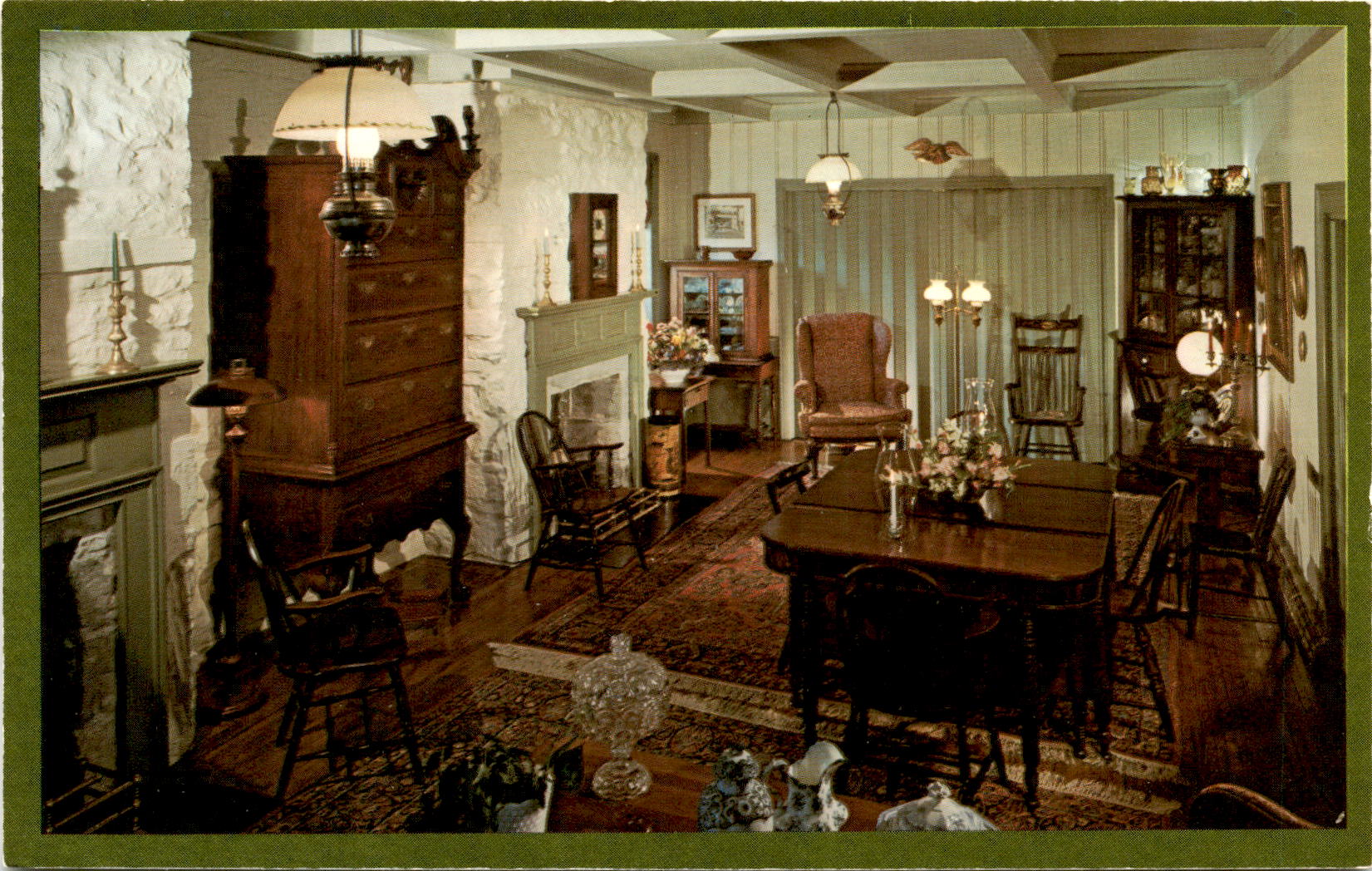 The postcard is promoting the Century Inn in Scenery Hill, Pennsylvania. It highlights the inn’s history as a stagecoach stop since 1794 and features an antique living room. The postcard was published and photographed by Jos. C. Unitas Color Products and made by Dexter Press.