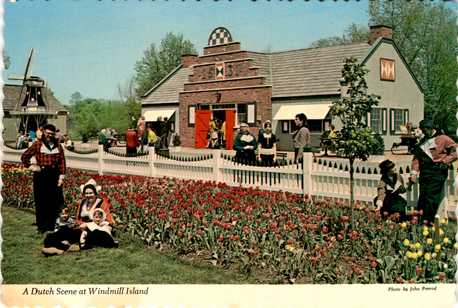 The postcard describes a scene at Windmill Island in Holland, Michigan, where the 17th century Dutch architecture and gardens are faithfully reproduced. The historic DeZwaan windmill is surrounded by colorful costumes, canals, and windmills, creating an atmosphere that takes visitors back 200 years into the Netherlands. The postcard is made by Dexter Press and the rights are reserved by OPENROD/HIAWATHA Card Co.