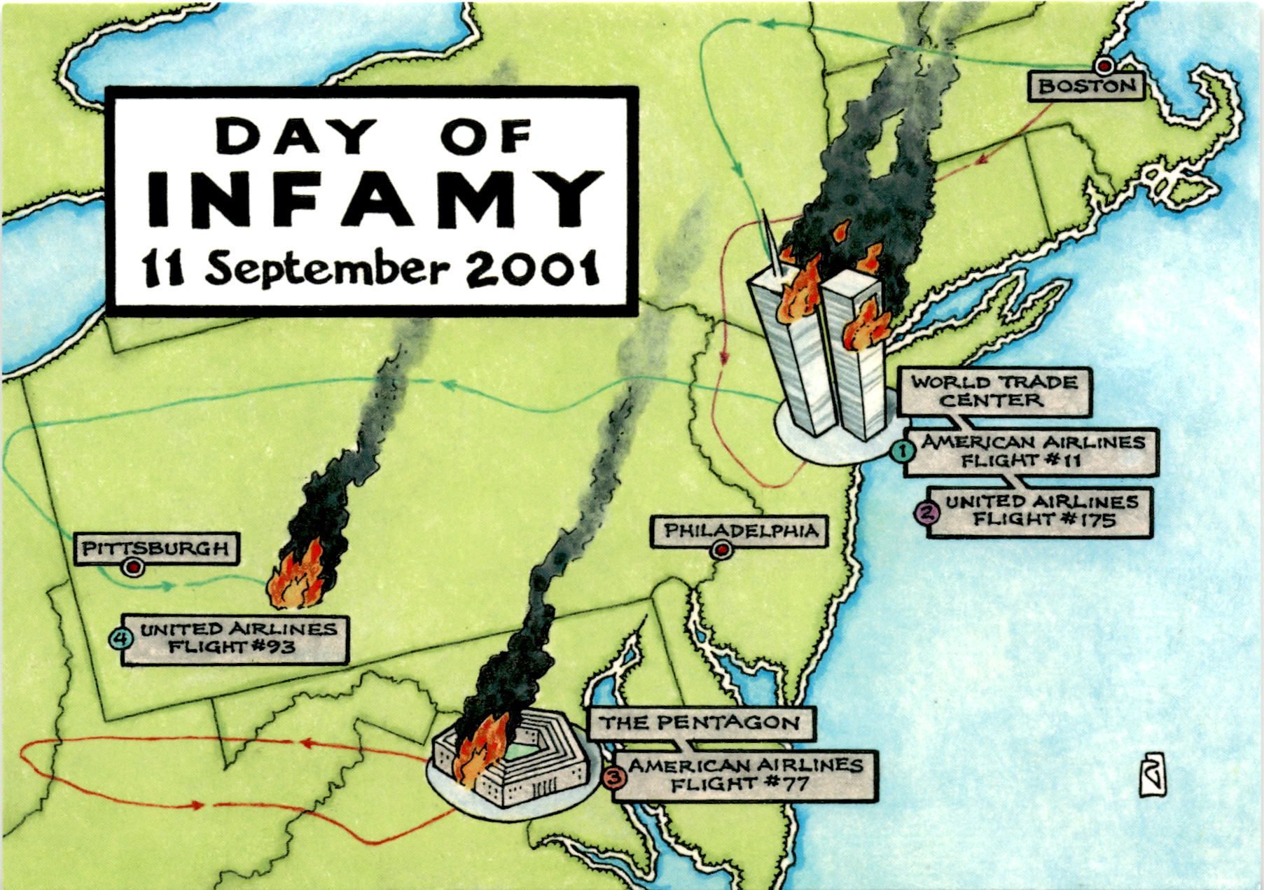 This postcard depicts the events of September 11, 2001, commonly known as the Day of Infamy. It includes references to various locations and flights involved in the terrorist attacks, such as United Airlines Flight #93 in Pittsburgh, American Airlines Flight #77 at the Pentagon, American Airlines Flight #11 and United Airlines Flight #175 at the World Trade Center in Boston. The postcard also provides contact information for Arcar Postcards by Rick Geary.