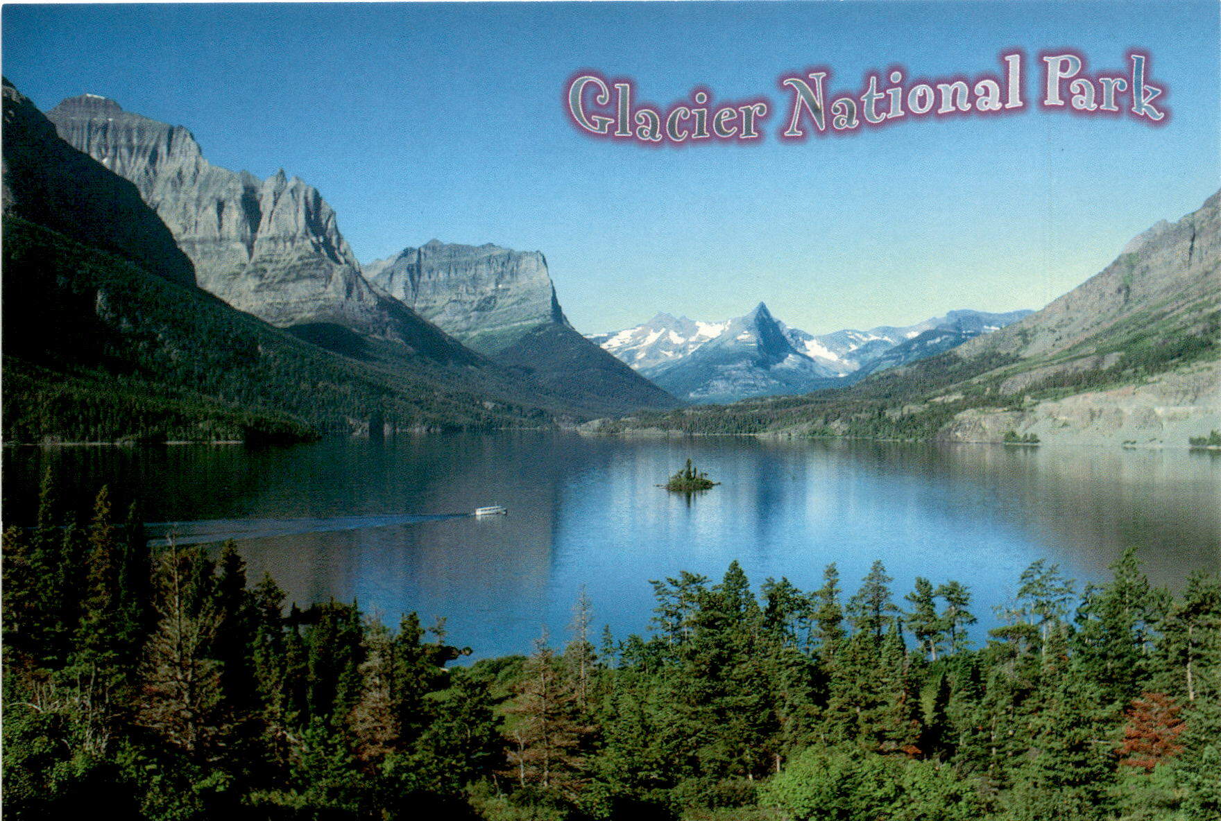 Back of PostcardThis postcard features a stunning view of St. Mary Lake and Wild Goose Island in Glacier National Park, Montana. The island was named after a pair of wild geese that nested there for many years. The background of the photo showcases the majestic Little Chief, Citadel, and snowclad Fusillade Mountains. The photos were taken by Dan Sample and the postcard is distributed by Dan Sample in Bozeman, Montana. It is printed in Canada.