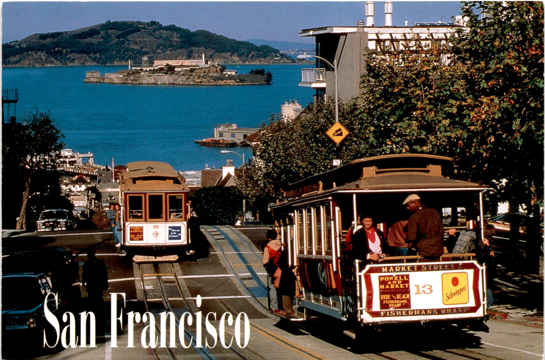 This postcard features a photo of cable cars passing on the Hyde Street line in San Francisco. The photo was taken from atop Russian Hill and shows Alcatraz in the distance. The postcard is printed in Korea and distributed by Smith Novelty Company. It is a depiction of the market area in San Francisco, specifically Market Street, Powell, and Market, as well as Fisherman’s Wharf. The postcard is labeled as “FISHERMANS WHARF E-319” and includes the brand name Schweppes. The address of the distributor is 460 Ninth Street, San Francisco, CA 94103.