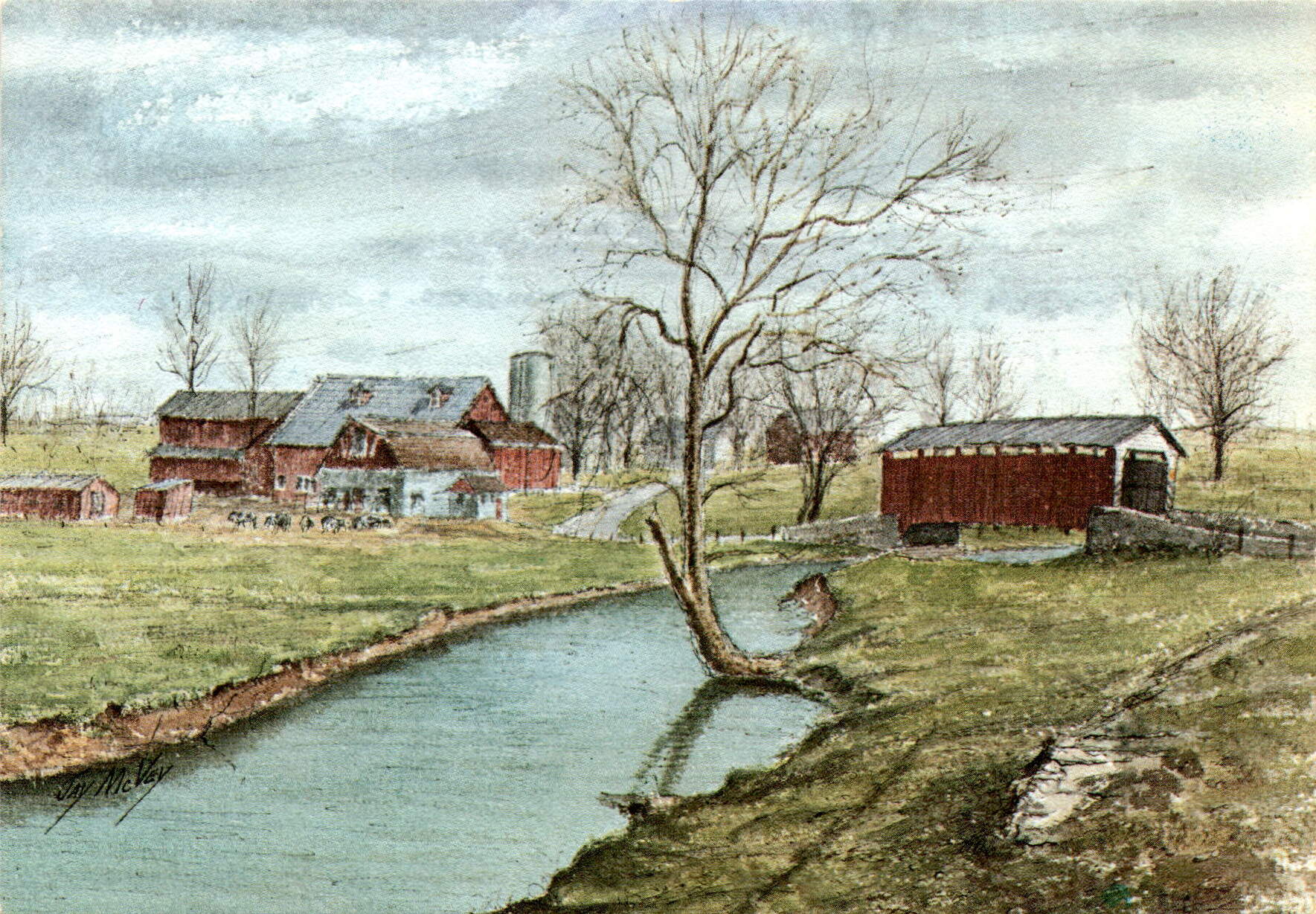 This postcard features a watercolor painting titled “Dutch Meadow” by Jay McVey. The painting depicts a covered bridge leading to an Amish Farms advertisement. It was published by STEL-MAR and the address is 329 Rhoda Dr., Lancaster, Penna. The postcard is suitable for sending through mail and requires a stamp.