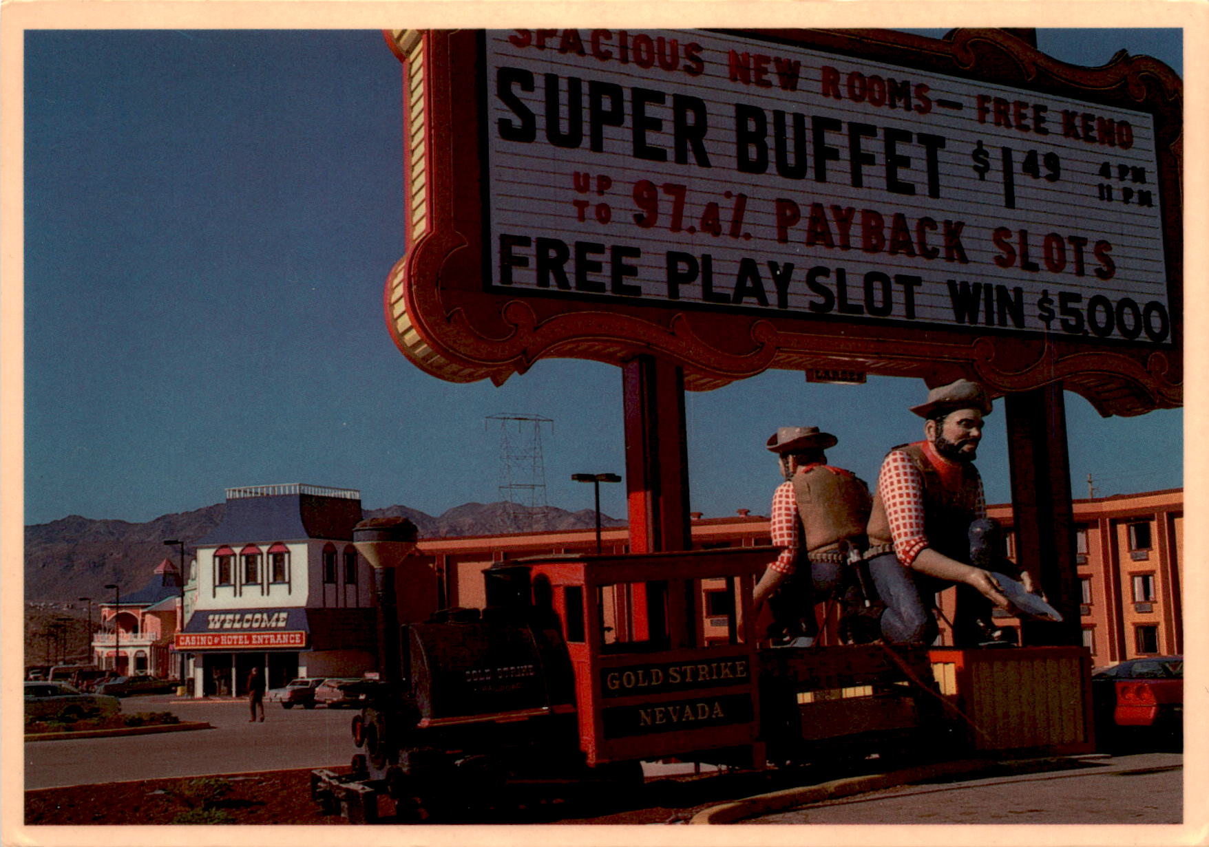 Welcome to the Gold Strike Inn and Casino in Nevada! Our casino hotel entrance offers a spacious and newly renovated rooms, with a complimentary Kend. Don’t miss out on our super buffet for only $149, and our payback slots have a high payout percentage of 97.4%. Play our free slots for a chance to win $5000. Located near Boulder City and Hoover Dam, our colorful Gold Strike Inn and Casino is a unique recreation of a frontier gold rush town. Just a short drive away from Las Vegas, this postcard captures the essence of our vibrant and exciting destination. Color by James Blank. Published by Ocean Desert Sales, Inc., Las Vegas, NV 89109. DT-89871-D. Send the very best and wish your loved ones good luck with these prints.
