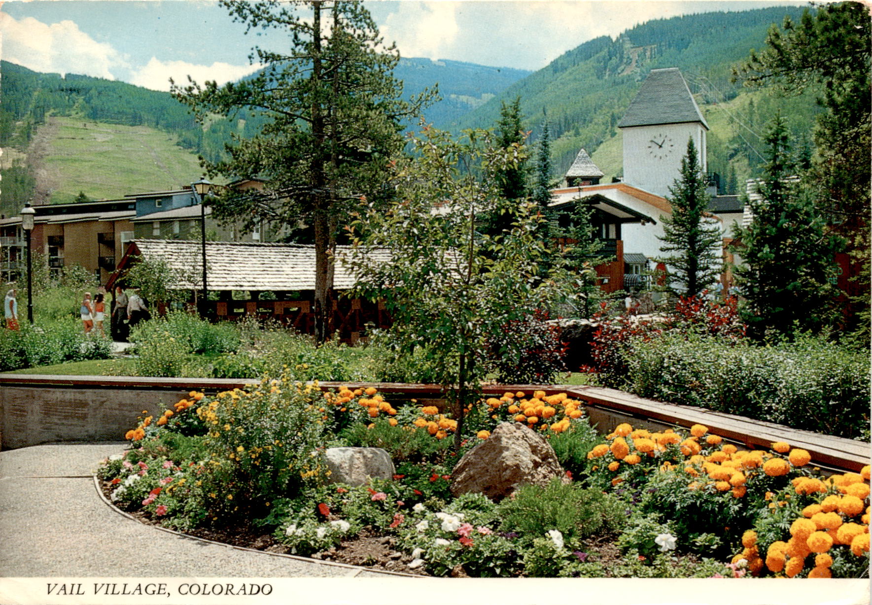 Back of PostcardThe vintage postcard is focusing on Vail Village, Colorado in the summer. The image on the postcard is most likely showcasing the beauty of the village, with mentions of pretty scenery and petunias. There is also a mention of noisy vehicles and racing engines, indicating that there may be some sort of event or activity happening in the village. The weather is described as beautiful, and the sender mentions going on a gondola ride to the top of Vail Mountain. Overall, the postcard highlights the natural beauty and recreational opportunities of Vail Village in the summer.