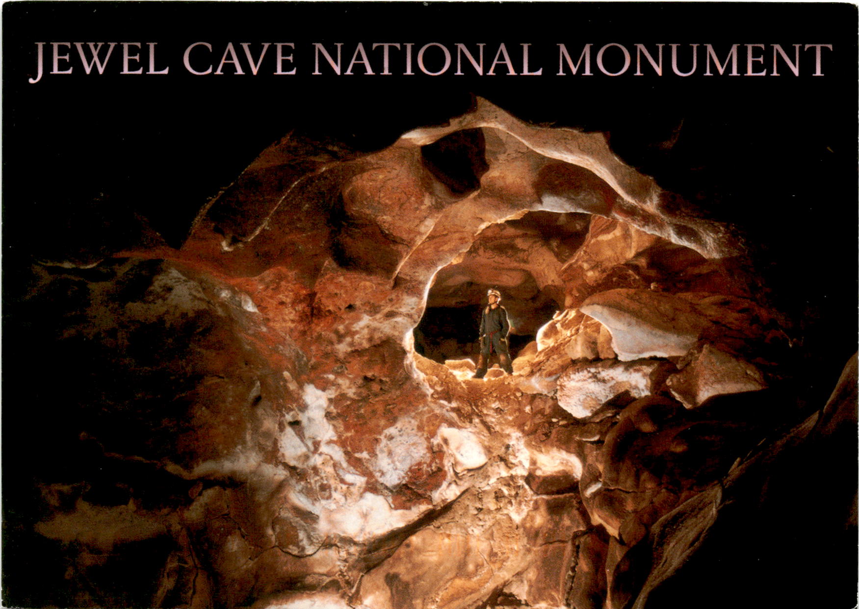 The vintage postcard is focusing on Jewel Cave National Monument. The image on the postcard is most likely of the cave’s underground environment, featuring unusual speleothems and thick crystal deposits. The postcard highlights the cave’s massive length, single natural entrance, and ongoing exploration and discovery, making it one of the last frontiers.