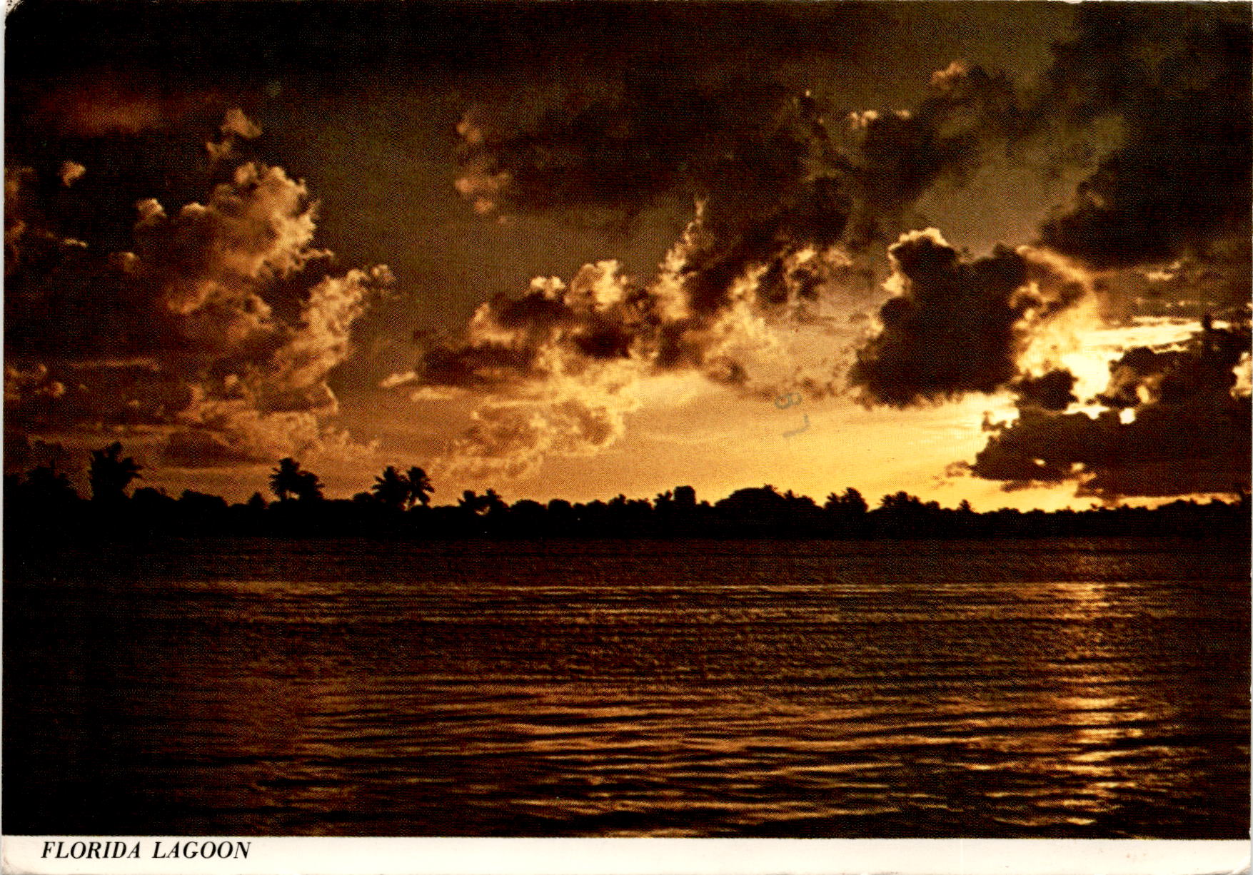 This postcard describes the beauty of the Florida Keys, with its palm trees and pretty blue ocean. It mentions that the fish are running and when people clean them, pelicans come to get the leftovers. The sender caught 12 big fish and is planning to have a fish fry. They also mention going to Disney World. The weather is getting warm after a cold Monday and Tuesday. The sender’s child, Kam, is having fun playing outside. They expect to return home next weekend. The postcard features a sunset across a Florida lagoon.