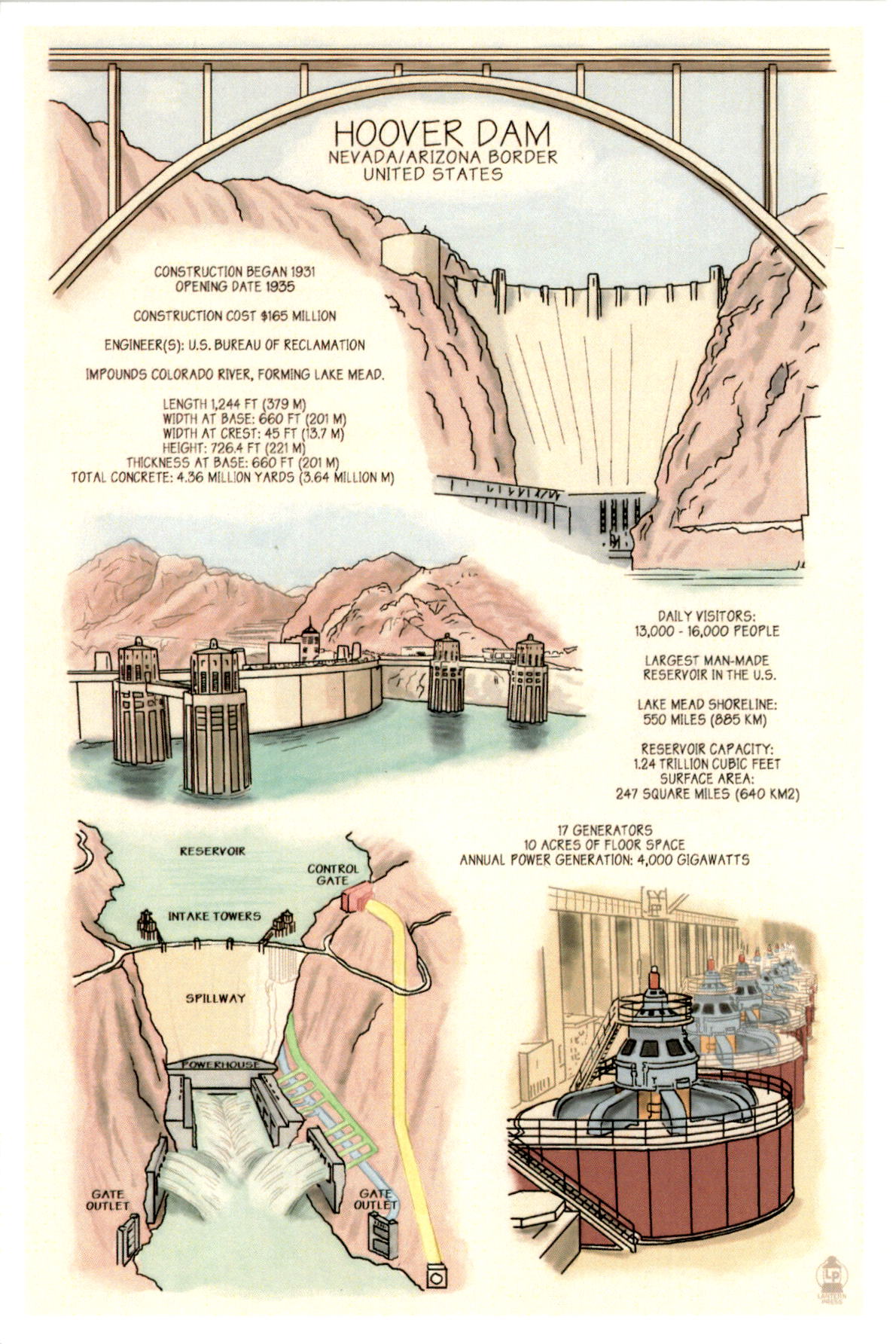 The Hoover Dam, located on the Nevada/Arizona border in the United States, was constructed between 1931 and 1935 at a cost of $165 million. It was engineered by the U.S. Bureau of Reclamation and serves to impound the Colorado River, creating Lake Mead. The dam is 1,244 ft (379 m) long, with a base width of 660 ft (201 m) and a crest width of 45 ft (13.7 m). It stands at a height of 726.4 ft (221 m) and has a thickness of 660 ft (201 m) at the base. The dam contains a total of 4.36 million yards (3.64 million m) of concrete. It features intake towers, a spillway, a powerhouse, and control gates. The dam attracts daily visitors ranging from 13,000 to 16,000 people and is home to the largest man-made reservoir in the U.S., Lake Mead, with a shoreline of 550 miles (885 km). The reservoir has a capacity of 1.24 trillion cubic feet and covers a surface area of 247 square miles (640 km2). The dam houses 17 generators and occupies 10 acres of floor space. It generates an annual power of 4,000 gigawatts. The Hoover Dam is a popular tourist destination and is situated within the first national park in the U.S. designated for recreation, providing 290 square miles of water in the lakes Mead and Mohave. The postcard is an original print by Lantern Press and is made in the USA using non-toxic ink on recycled paper.