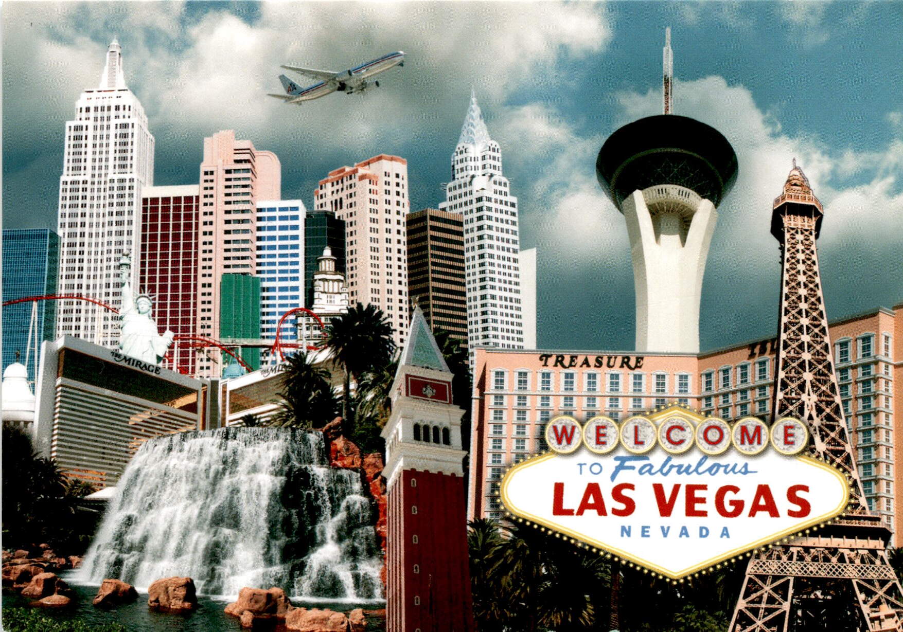 This postcard features a design of the famous Las Vegas sign and the words “Welcome to Fabulous Las Vegas, Nevada.” It also includes the image of a treasure chest and the word “Treasure.” The postcard is printed in China and distributed by Karol Western Corp. It is part of the Unique group and has a unique code of 23166 01000 3. The postcard is part of a series that includes other designs.