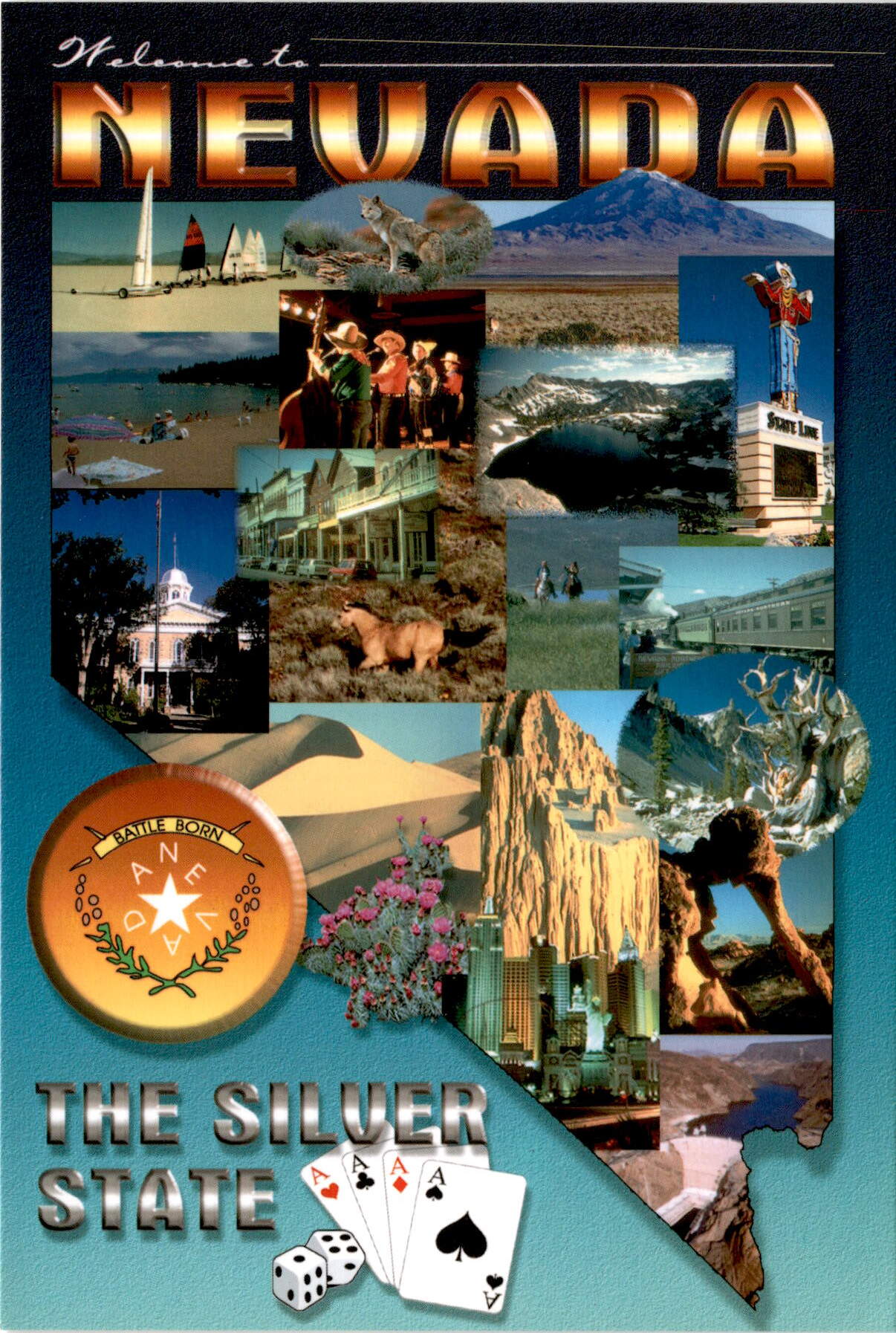 This postcard is a description of Nevada, the 36th state to enter the Union on October 31, 1864. The state capital is Carson City and the population is 1,202,000. Nevada is known as the Silver State and has an area of 110,540 square miles. The state bird is the Mountain Bluebird, the state flower is Sagebrush, and the state tree is the Single-leaf Pinon. The postcard was created, designed, and published in the USA, with photos by G.M.W.S. It is a unique postcard that showcases the beauty and treasures of Nevada.
