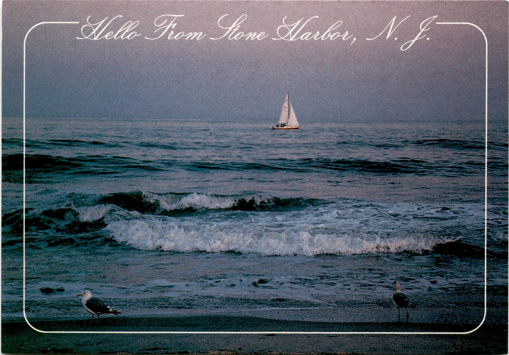 Back of PostcardThis postcard features a pastel portrait of the seashore in Stone Harbor, New Jersey. The photo was taken by Dick Leonard. The postcard is from Freeman Post Cards and has the address and stamp placement on the back. The item number is J16337.