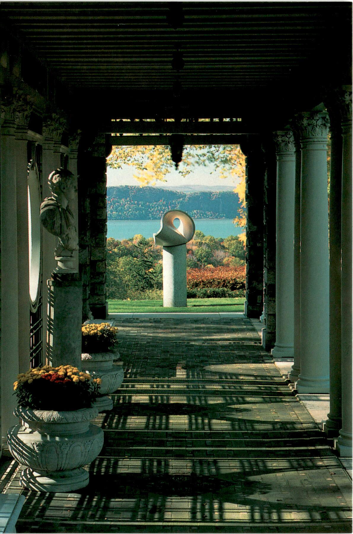 Back of PostcardThis postcard features a photo taken at null Kykuit, Pocantico Hills, NY, which is a property owned by the National Trust for Historic Preservation. The photo shows a pergola designed by William Welles Bosworth, framing a sculpture called Triangular Surface in Space, made of granite and created by Max Bill in 1962. In the background, you can see the Palisades of the Hudson River. The photo was taken by Ron Blunt.