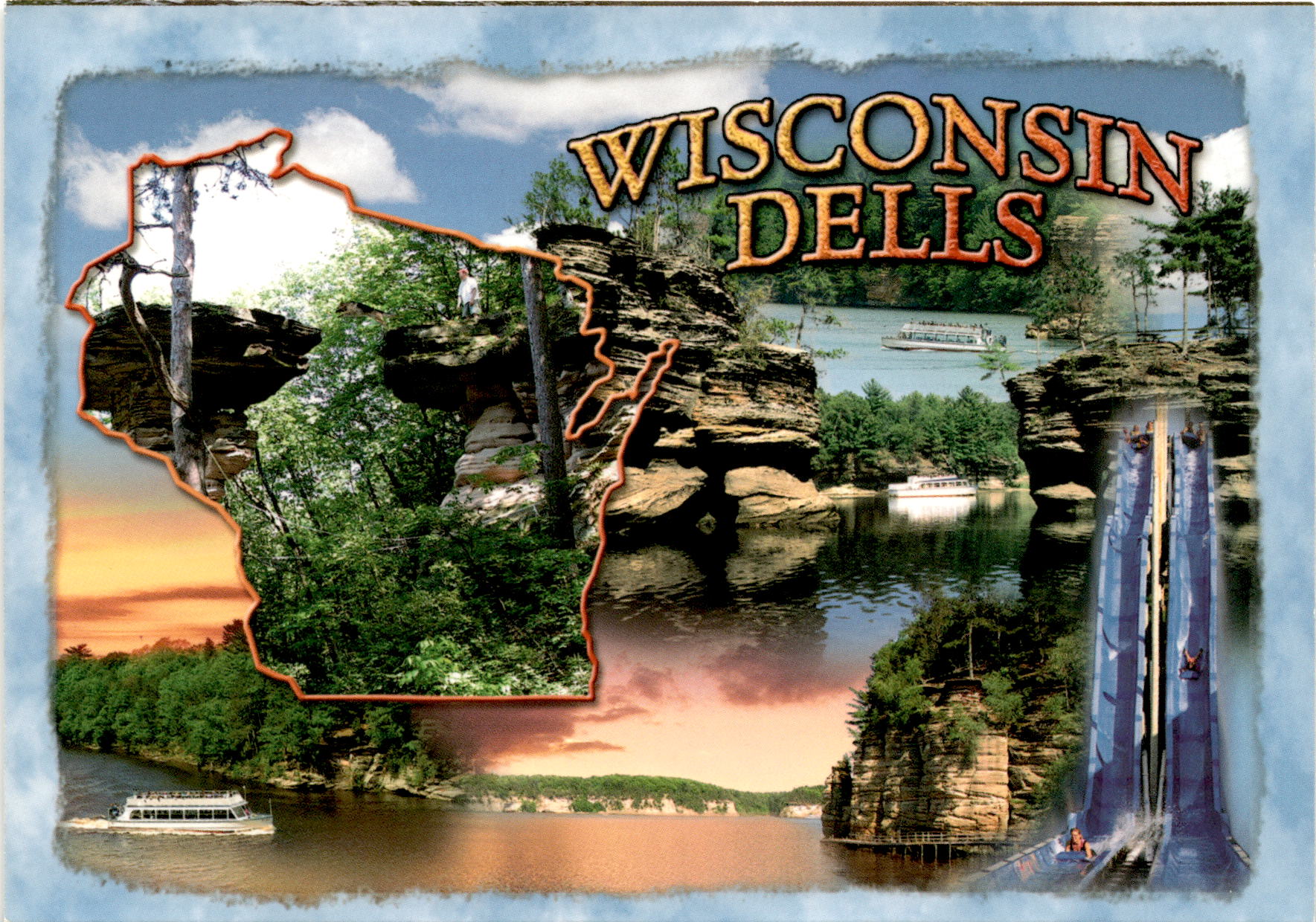 This postcard features photos of the Wisconsin Dells taken by Buddy Moffet and Craig A. Schulze. It is sold by the Northwoods Trading Company located in St. Germain, Wisconsin. The postcard is printed in the USA and has a unique identification number. The manufacturer is John Hinde Curteich. The space on the back of the postcard is reserved for the U.S. Postal Service.