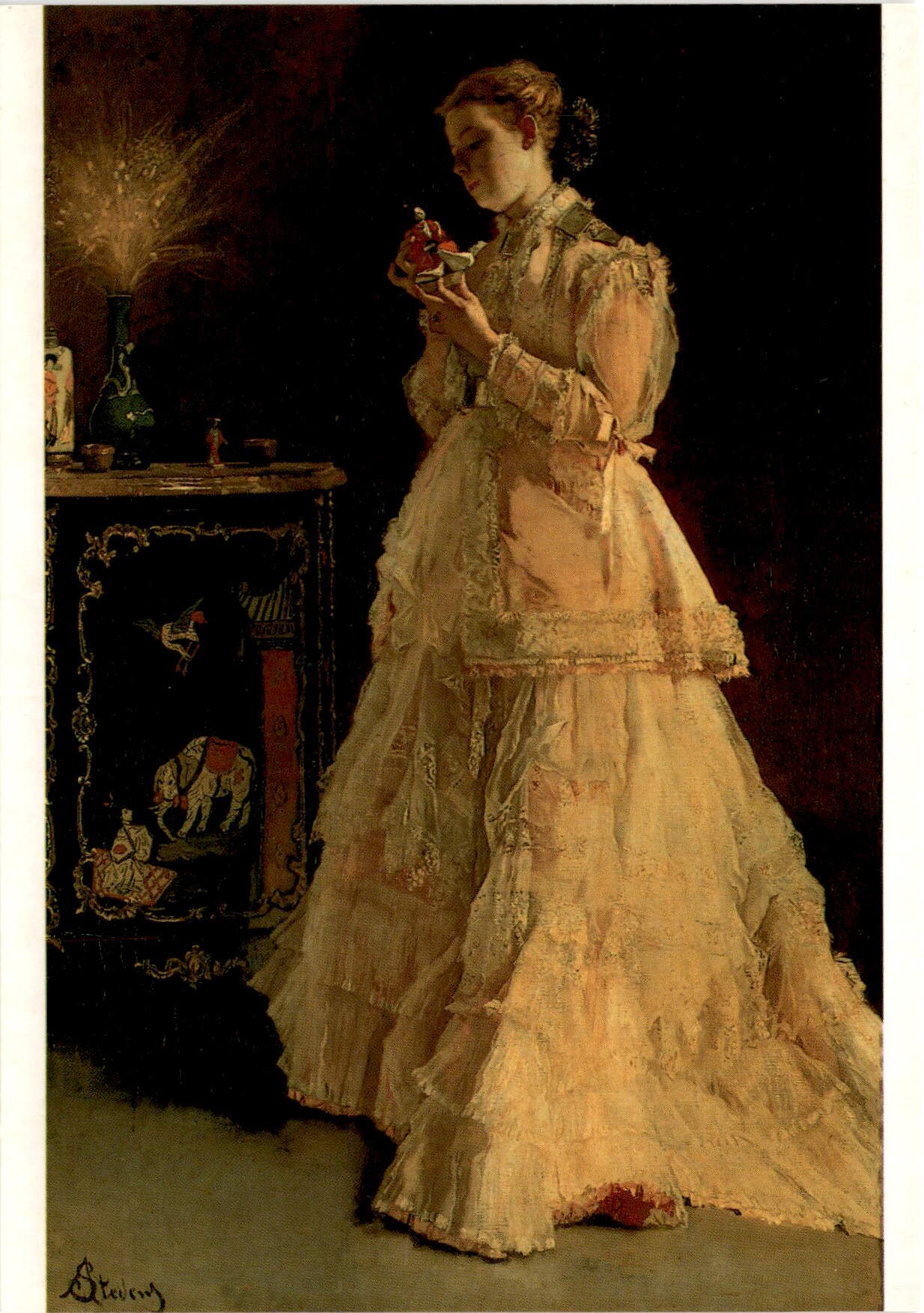This postcard features the artwork “La dame en rose” or “De dame in het roze” by Alfred Stevens. The painting was created in 1866 and is currently housed in the Royal Museums of Fine Arts of Belgium in Brussels. The postcard is printed in Belgium by Lannoo and features the inventory number 1793.