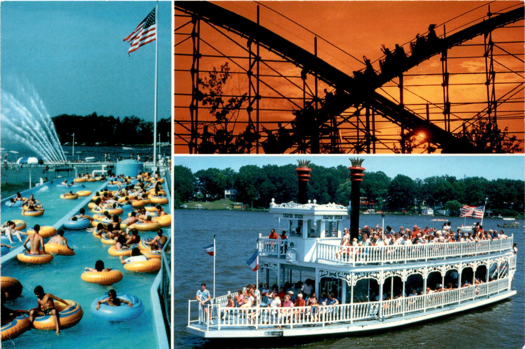 The postcard features a picture of the suspension bridge entrance to Indiana Beach amusement resort and vacationland in Monticello, Indiana. The Hoosier Hurricane roller coaster is highlighted, with its turn-around and pinnacle drop under the bridge providing an exciting thrill. The postcard is from Mike Roberts in Oakland, CA and is associated with Indiana Beach, Inc.