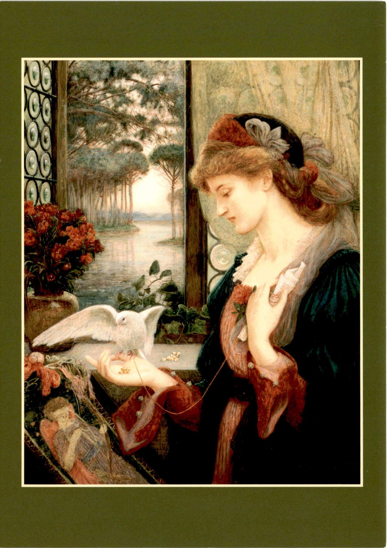 This postcard features a painting titled “Love’s Messenger” by Marie Spartali Stillman. The artwork was created in 1885 and is made using watercolor, tempera, and gold paint on paper. It is mounted on wood and measures 32 x 26 inches. The painting is part of the Samuel and Mary R. Bancroft Memorial collection at the NAN Delaware Art Museum.