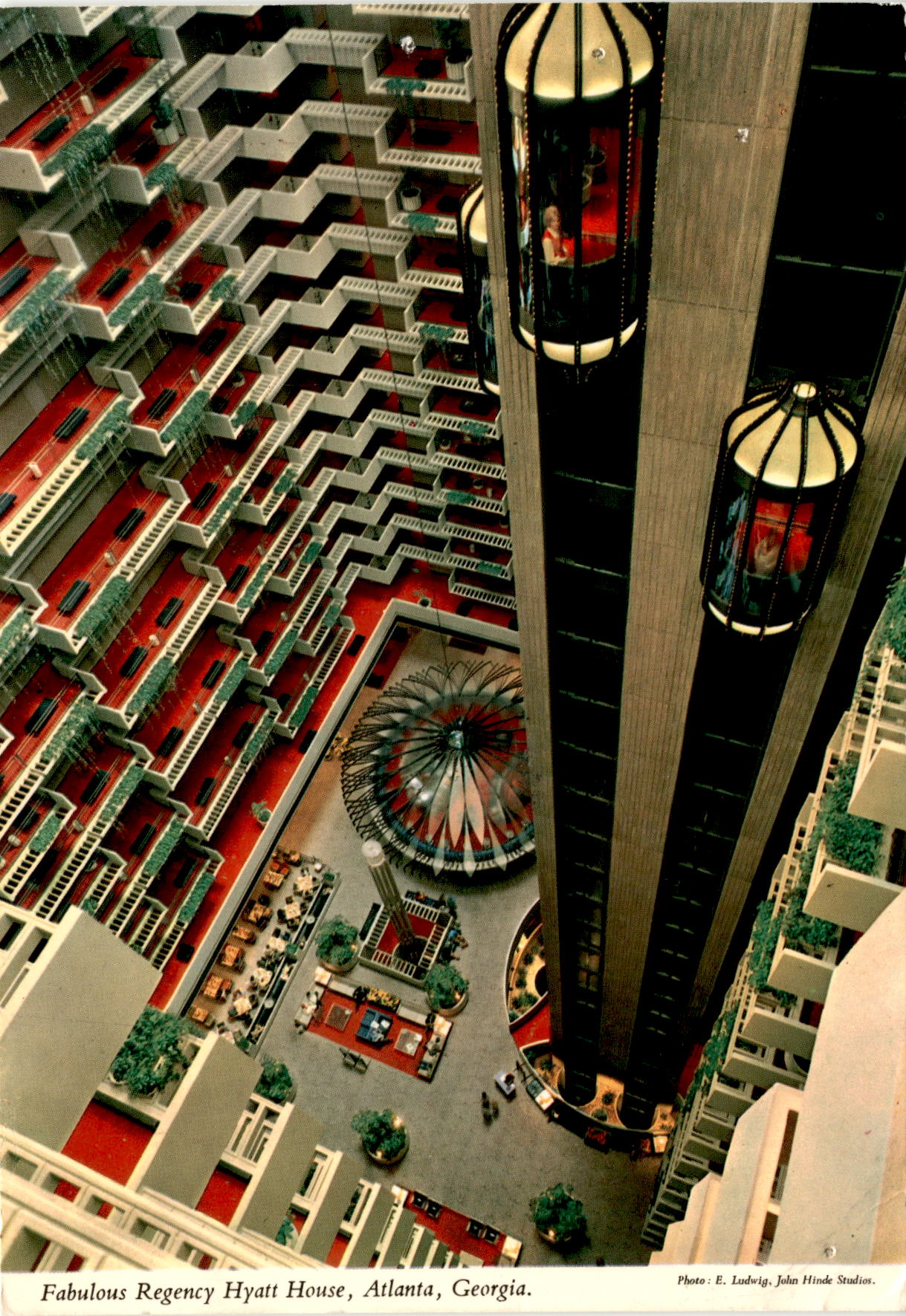 The postcard features a photo of the Fabulous Regency Hyatt House in Atlanta, Georgia. The hotel is known for its unique design and 1,000 rooms. It has a covered atrium with high-speed elevators, a water fountain, and an elevated cocktail lounge. On top of the hotel is the revolving Polaris restaurant, which offers a panoramic view of the Atlanta skyline. The postcard is printed and published by John Hinde Limited in Dublin, Ireland.
