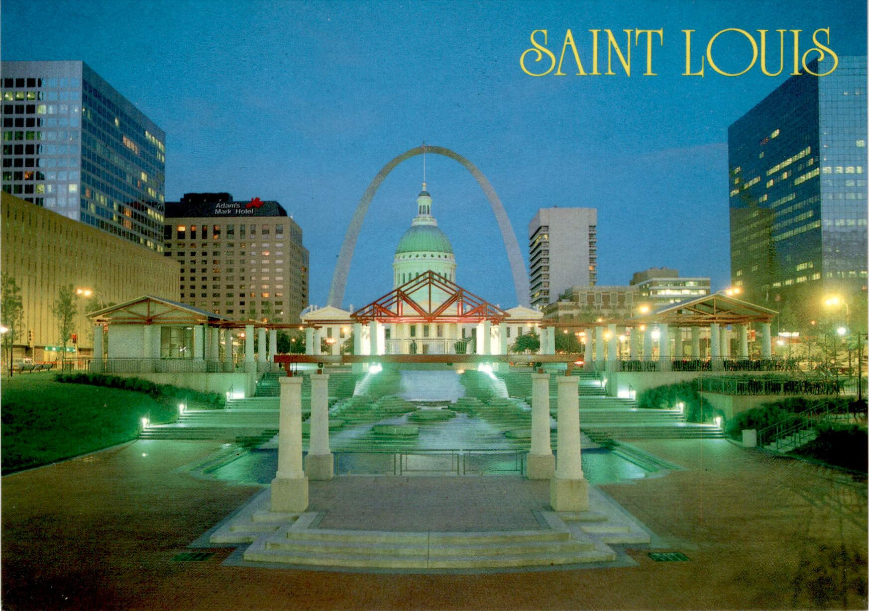 Postcard features photo of Saint Louis amphitheater and landmarks.