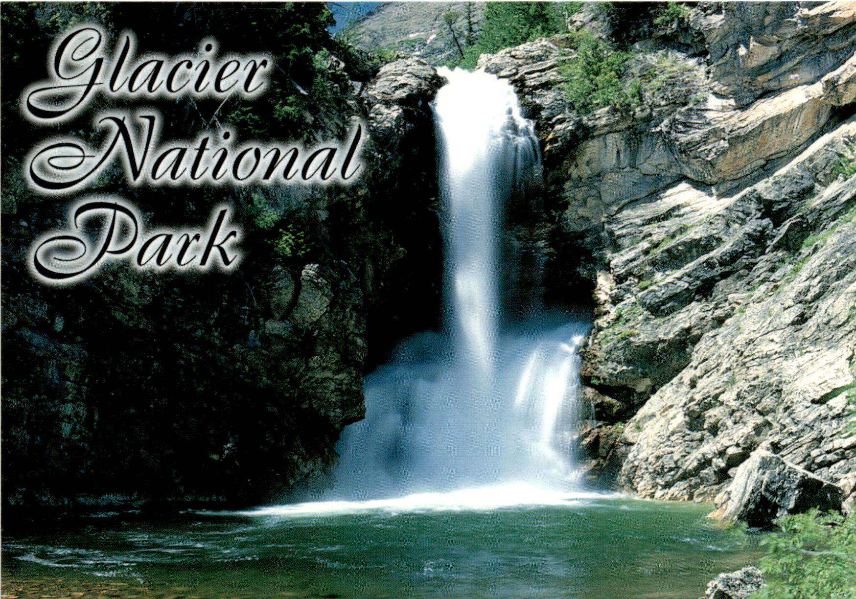 This postcard features a stunning image of Running Eagle Falls, also known as Trick Falls, in Glacier National Park, Montana. The waterfall is located between Middle and Lower Two Medicine Lakes and is known for its unique feature of a cavern that drains water from the river above the falls and spews it out halfway down. In the spring, high flows cover the opening, making the falls appear ordinary, but in the summer, when the river drops, the opening can be seen. During the fall, the entire river flows through the cavern. The postcard is a photo taken by Dan Sample and is distributed by DAN SAMPLEâ’¸.