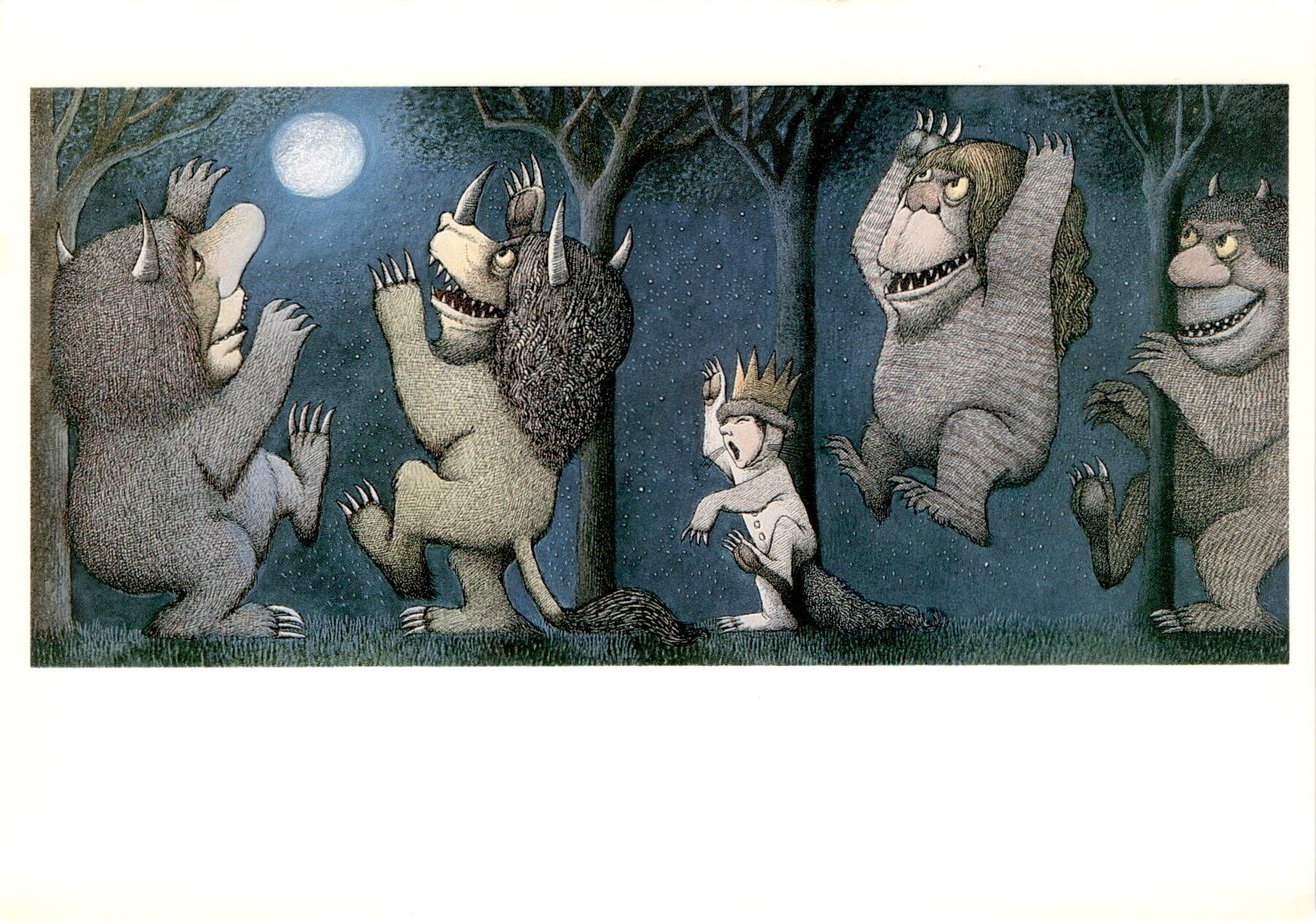 This postcard features an illustration titled “The Wild Rumpus” from the book “Where the Wild Things Are” by Maurice Sendak. The illustration is done in pencil, pen, ink, and watercolor. It is part of the Maurice Sendak Collection, which includes over 3000 drawings for book illustration. The postcard is sold by The Rosenbach Museum & Library, a place that houses rare books, manuscripts, prints, drawings, paintings, and antique furnishings in a 19th-century townhouse located at 2010 DeLancey Place, Philadelphia 19103.