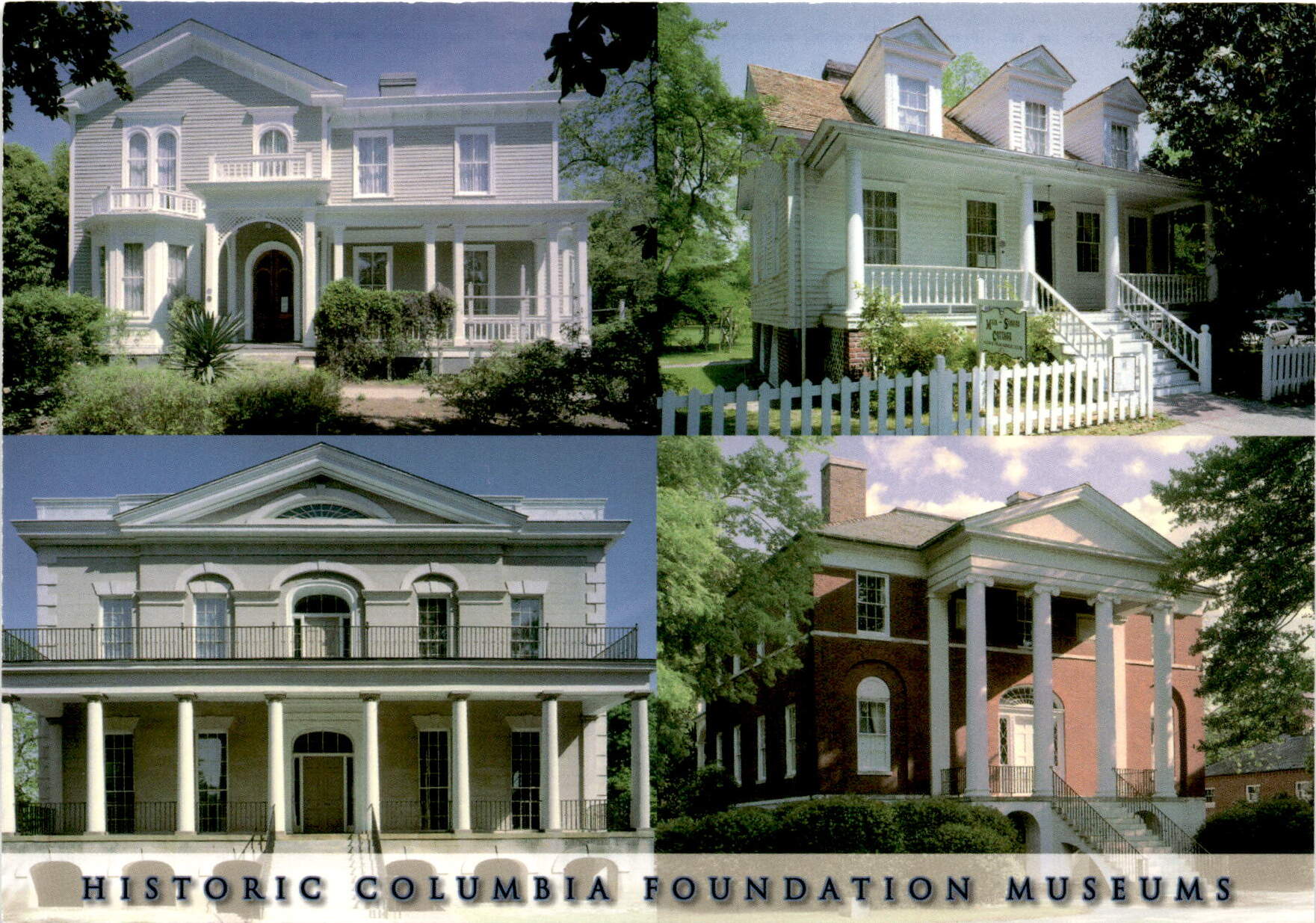 This postcard features four historic buildings in Columbia, South Carolina. The upper left shows the Woodrow Wilson Boyhood Home from 1872, while the upper right displays the Mann-Simons Cottage restored to its 1870s appearance. The lower left showcases the Hampton-Preston Mansion from 1818, and the lower right features the Robert Mills House and Park from 1823. The photo on the postcard was taken by Bill Barlay and published by Photo Arts, Inc. The postcard was printed in the USA and has a unique identification number (K57237). The address section is reserved for the US Postal Service.