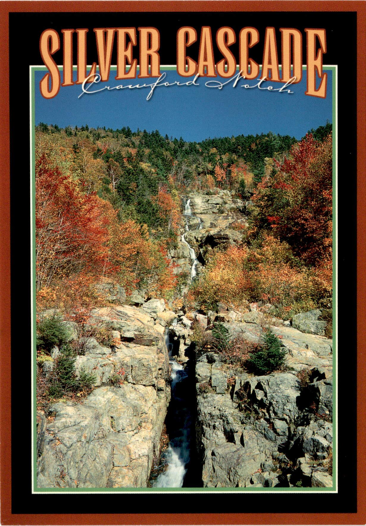 Silver Cascade is a popular hiking destination located in Crawford Notch. This postcard features a photo taken by James Blank and is published by Green Mountain Studios in Lyme, New Hampshire. It is printed in the USA and has a space reserved for the U.S. Postal Service. The postcard has a unique identification number of 41934 01919⁰⁰ and 43105 maracom 4.