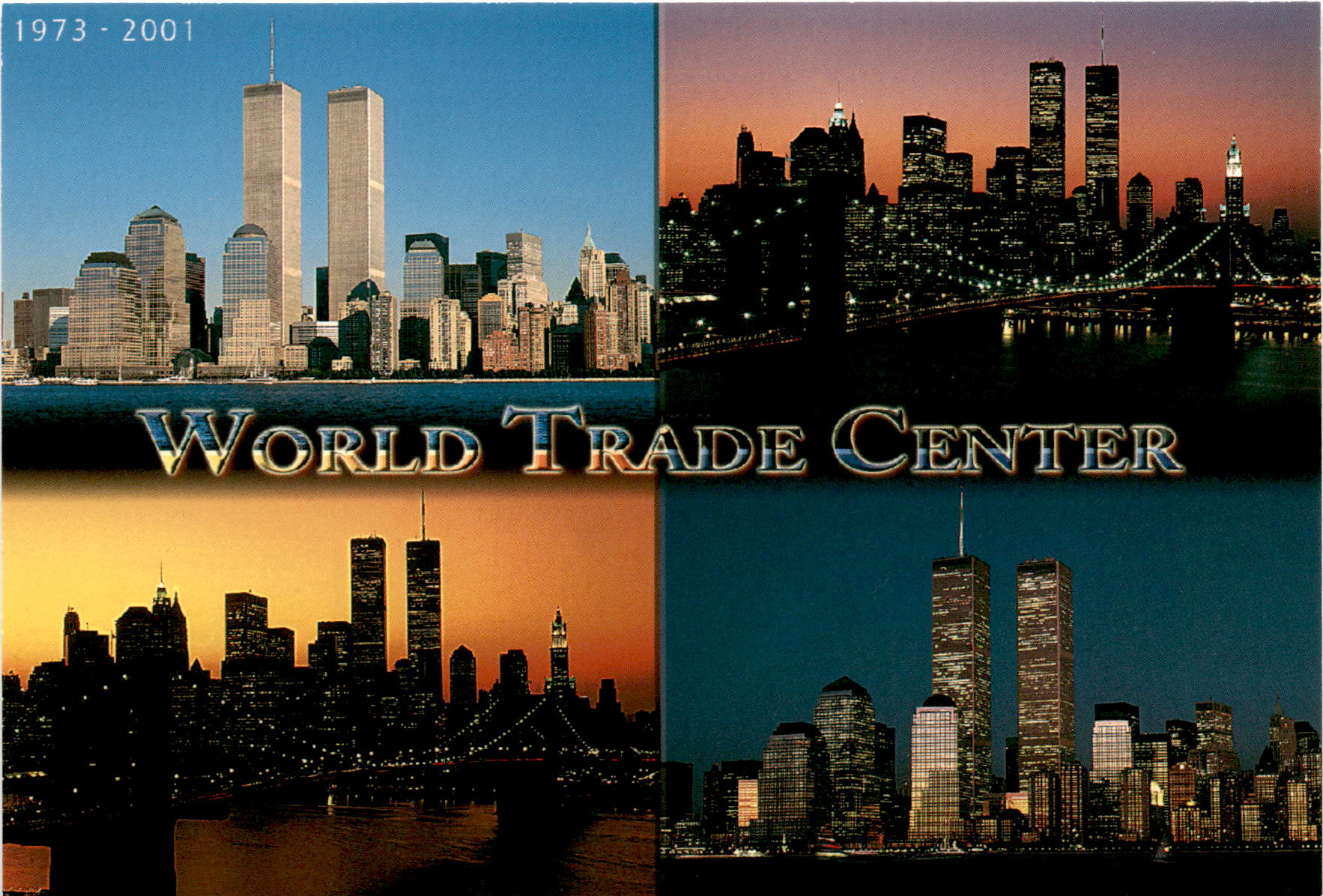 This text is a summary of a postcard that features the World Trade Center in New York City from 1973 to 2001. The postcard is produced by City Merchandise Inc., located at 68 34th Street, Brooklyn, NY 11232. The contact information for City Merchandise is TEL 718-832-2931, FAX 718-832-2939, and their website is www.citymerchandise.com.
