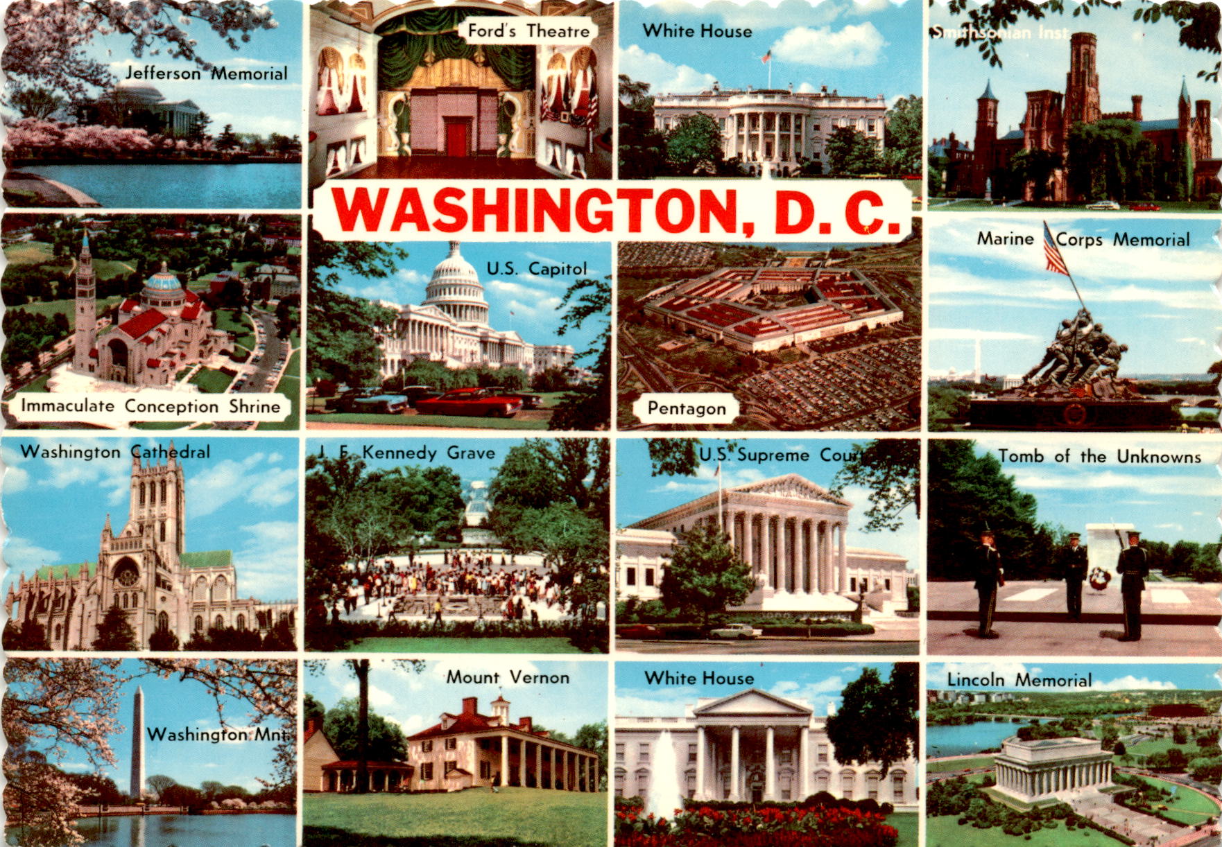 Postcard showcases Washington, D.C.’s landmarks and attractions.