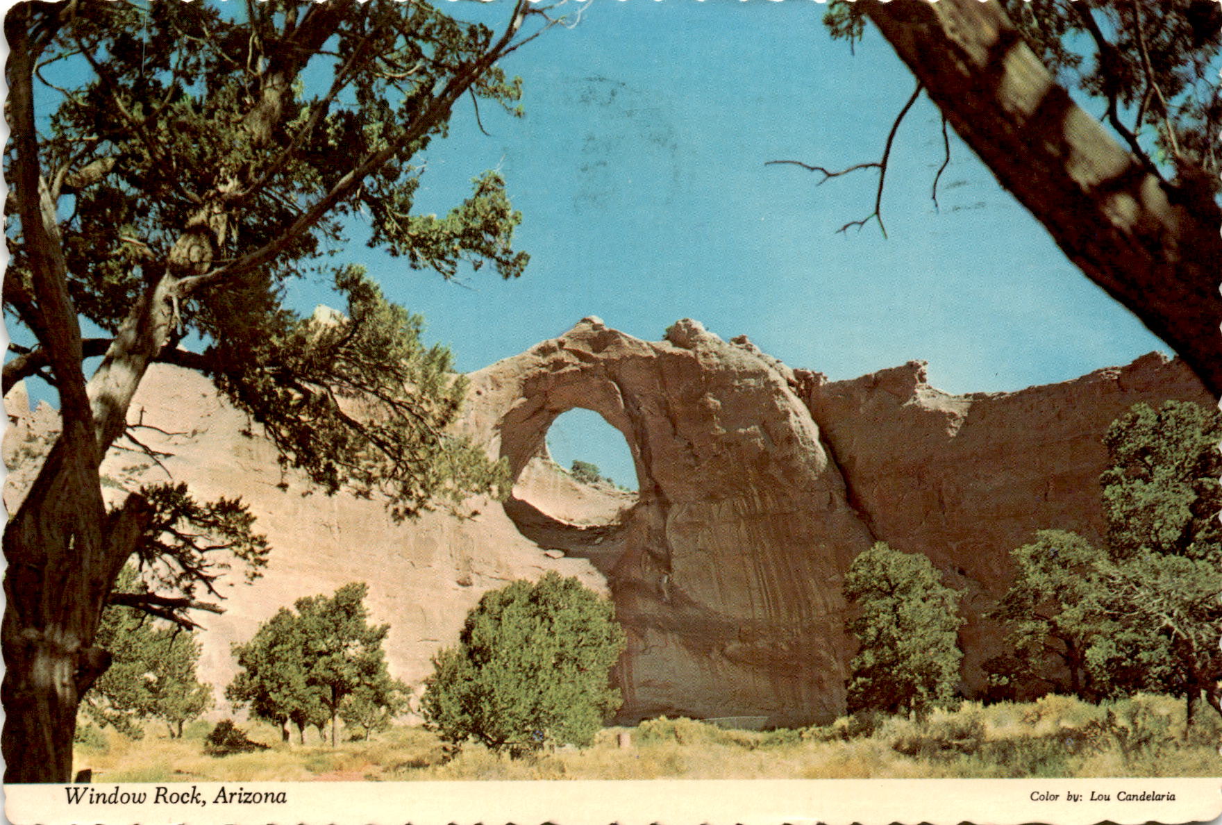 This postcard features a landmark called the “window” in Window Rock, Arizona, which is located on the Navajo Indian Reservation. The headquarters of the Navajo Tribe are also nearby. The postcard is addressed to Elsient Clarence and mentions that the sender is on a trip. The sender also mentions that their last stop was at 5 PM and that the ground was covered in white, resembling snow. However, the trip was marred by the tragic death of their son, David, in a motorcycle accident. The sender expresses their heartbreak and mentions that they were in Kansas at the time. Despite the advice of their parents and hostel, the sender decides to continue on their trip and remember their son as they last saw him. The postcard was made by Dexter Press, Inc. in West Nyack, New York.