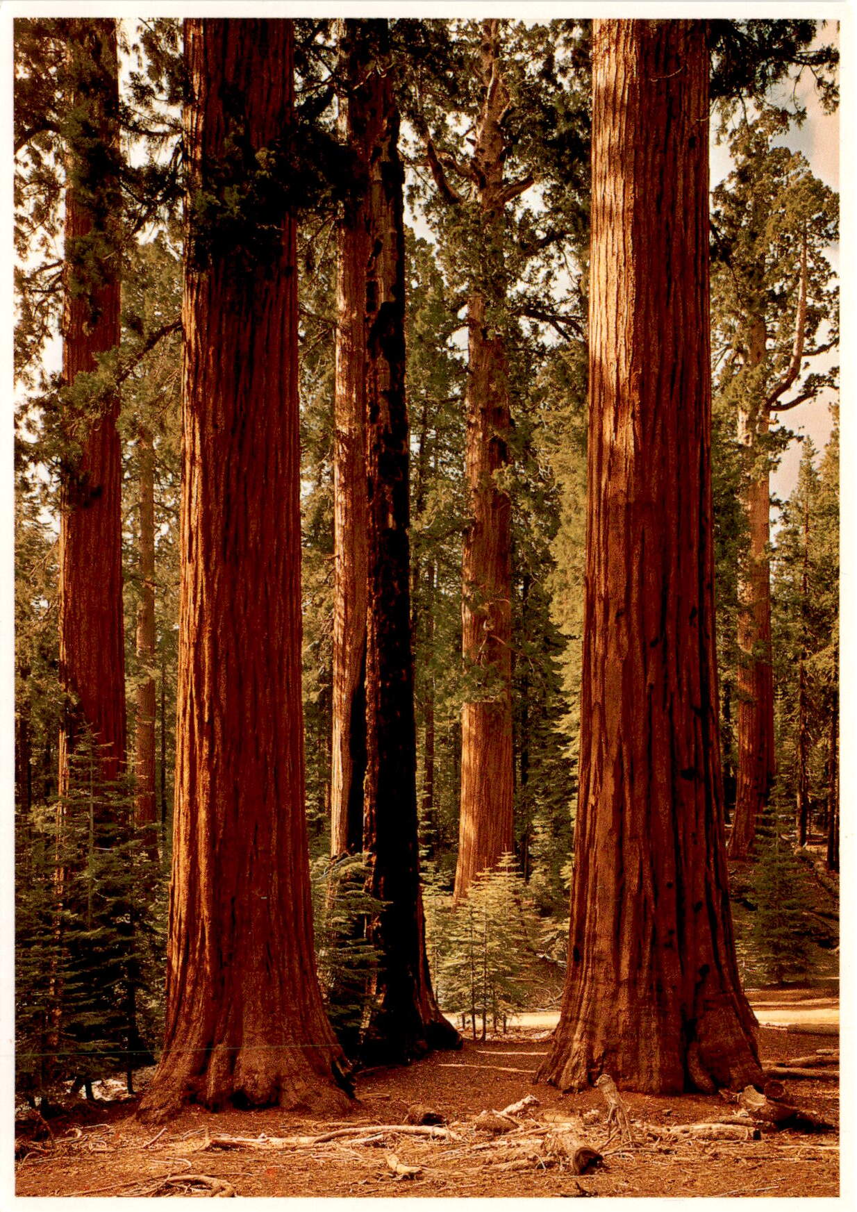 This is a postcard featuring an award-winning photograph of the Sequoia Redwoods in Mariposa Grove, Yosemite National Park. The photo was taken by Bob Clemenz and is part of the Impact Life Like Photo Art collection. The postcard was published by Impact in 1983 and printed in Japan.