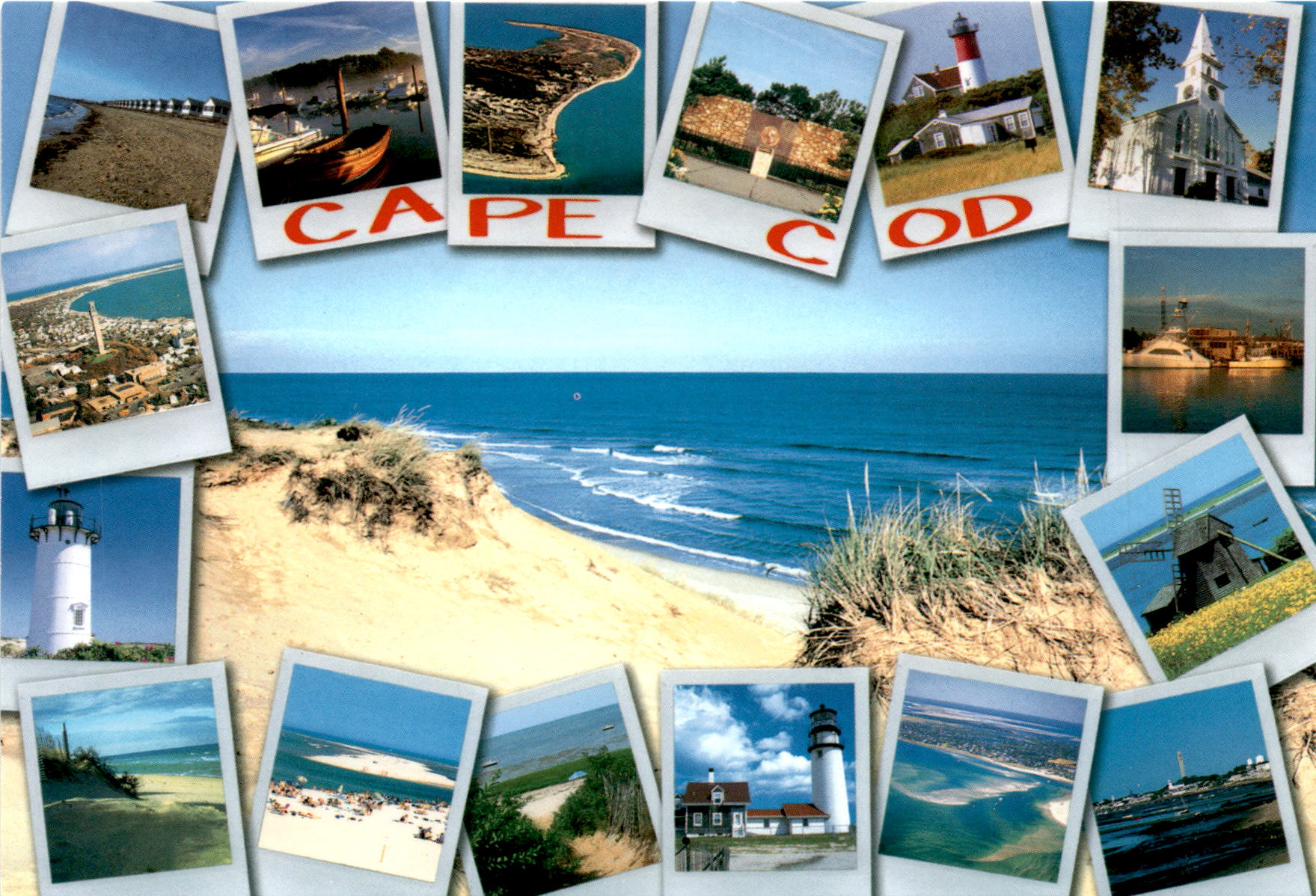 Back of PostcardThis postcard features images of Cape Cod, Massachusetts taken by various photographers. The card also promotes Martha’s Vineyard souvenirs and provides contact information for South Cape Distributors. The postcard is printed in Canada and includes a unique identification number.