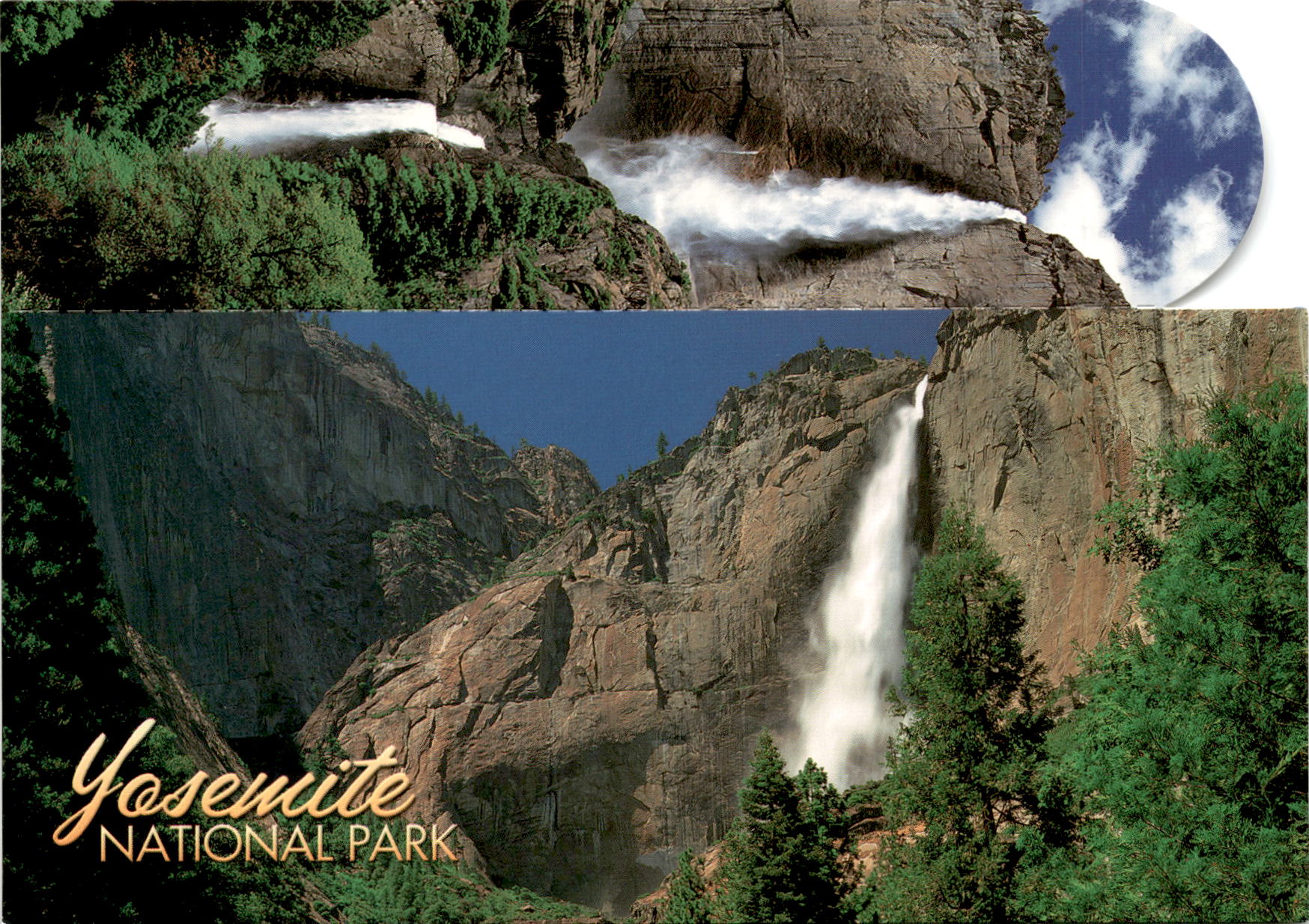 This postcard features a stunning image of Yosemite Falls, the tallest waterfall in North America. The falls cascade over three sections, with a total height of 2,425 feet. The beauty of Yosemite Falls is captured by photographer John Wagner. The postcard is produced by Impact and is made from recycled paper. It is designed and distributed in the USA and printed in Korea. Additional postage is required for mailing.