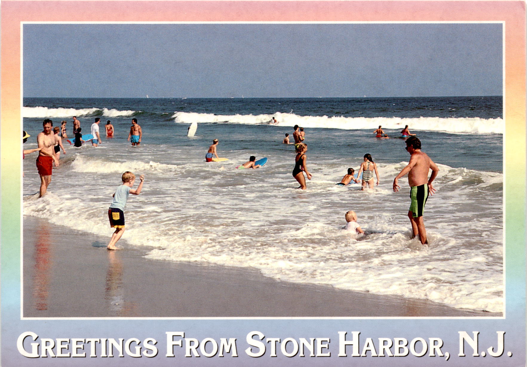 This postcard features a photo of ocean surf bathing in Stone Harbor, New Jersey, taken by Dick Leonard. It is a Freeman postcard from Longport, New Jersey. The address to be filled in is CP12483. The postcard is printed in the USA.