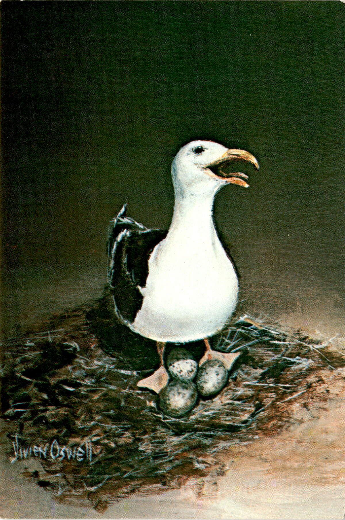 This postcard features a painting titled “Mrs. Herring Gull” by the well-known Cape Cod artist Vivien Oswell. The canvas size is 14″ x 18″. The postcard was printed in the USA by Aladdin Color and features a color photo of the painting. The contact information for Vivien Oswell is provided, along with the address of Aladdin Color. The postcard was created in 1974.