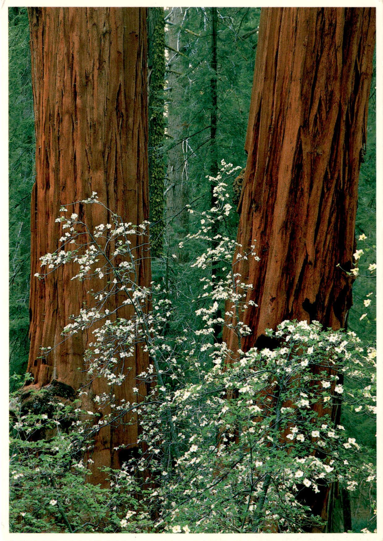 This postcard features a photograph taken by Ed Cooper of Dogwoods in bloom with giant Sequoia trees in Sequoia National Park, California. The postcard is printed in Japan for Impact.