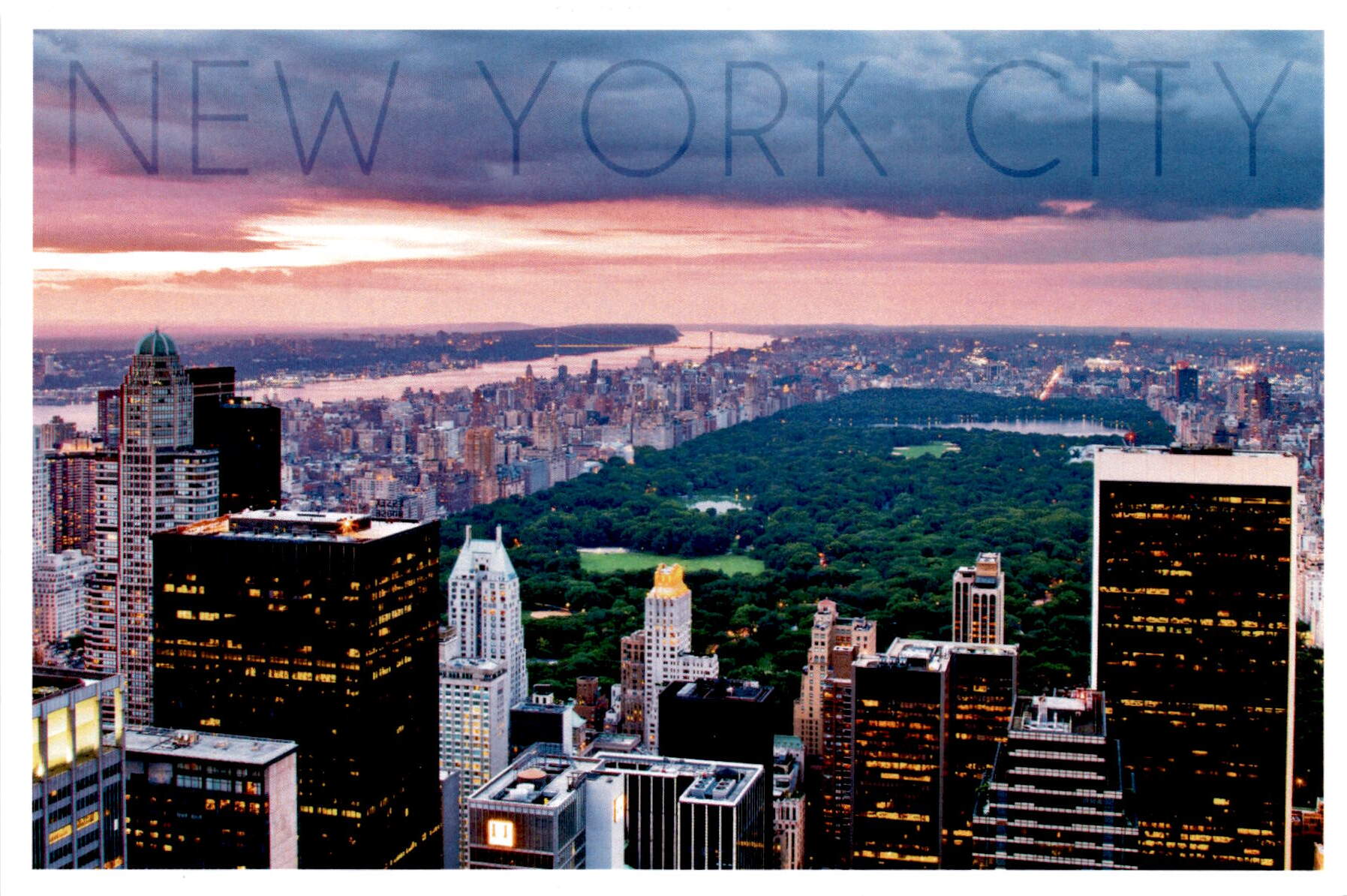 This postcard features a photograph of the pink and purple skyline of New York City. The image was taken by Lantern Press Photography and printed by Lantern Press in Seattle, WA. The postcard is printed on recycled paper using non-toxic ink and is made in the USA.