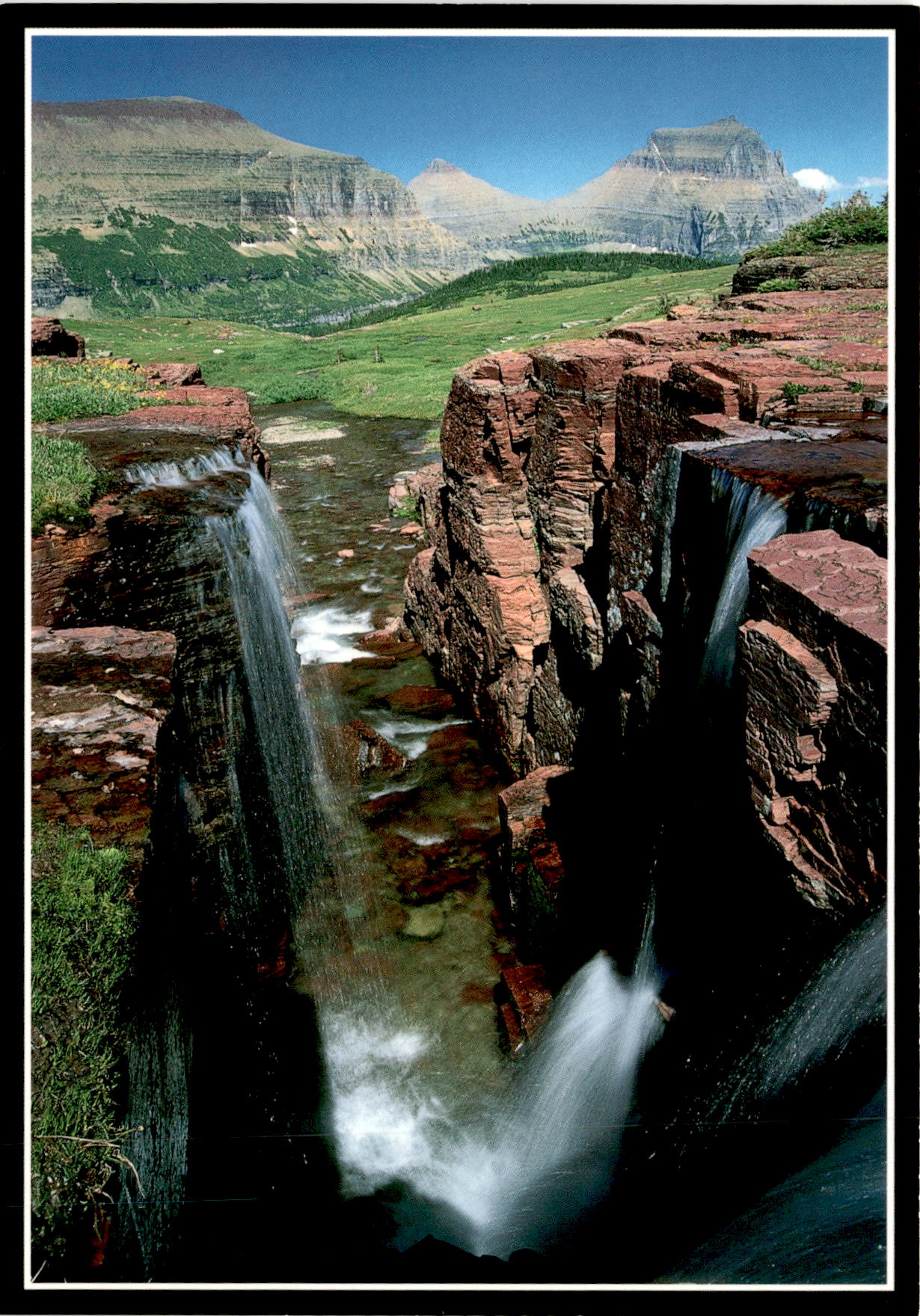 This postcard features a stunning view of Double Falls, located inside Glacier National Park. Visitors can experience this breathtaking scene while hiking the trails from the Logan Pass visitor center on the Going to the Sun Highway. The postcard is published by Big Sky Magic Postcards and features a photograph by Mark A. Schwartznau. It is printed in the USA and has a unique identification number.
